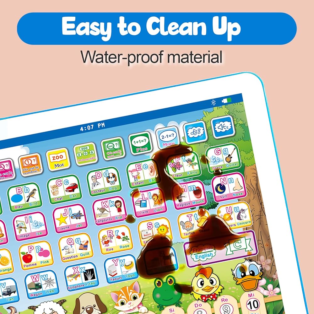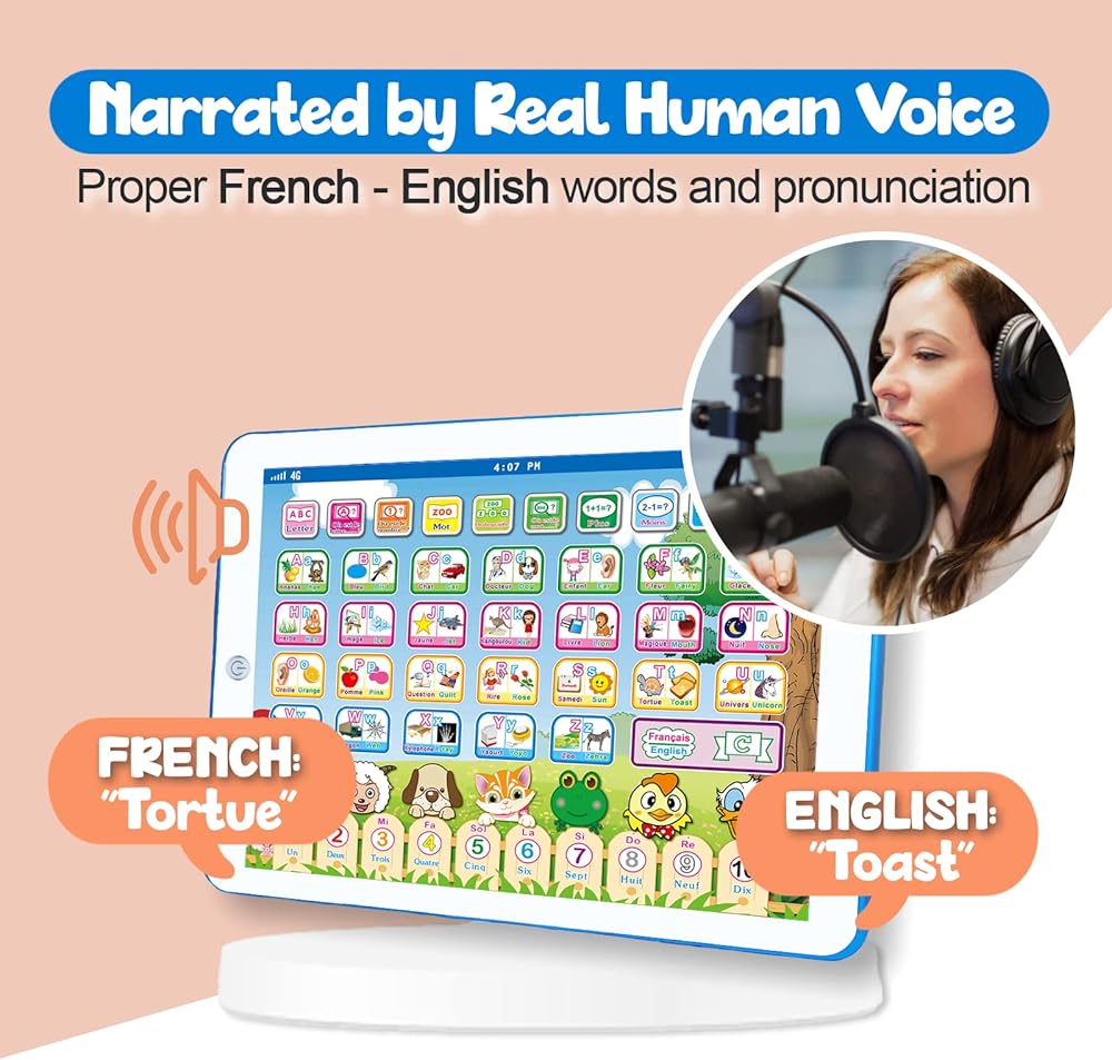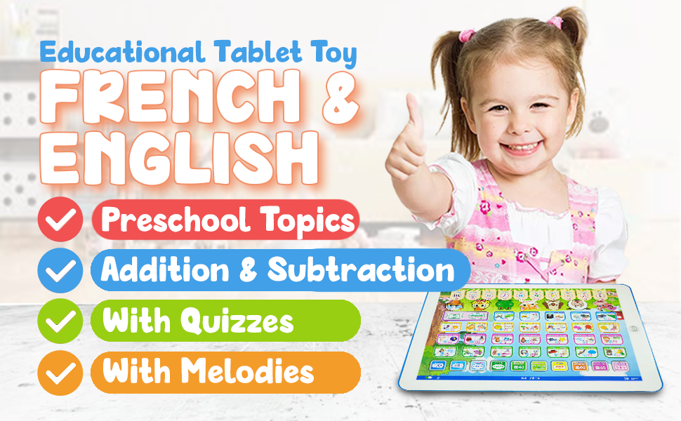 【Musical Piano Keys】In addition to its full packed educational content, this bilingual toys French & English has musical piano keys that your kids will surely enjoy! Let them be a little musician and create their own sounds, or let them dance and sing along to this tablet's songs and music!