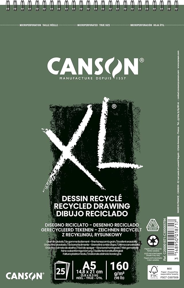 Genuine drawing paper, made from 100% recycled paper, XL Recycled Drawing withstands erasing and scraping, and will not flake. Its light, finely honeycombed grain, has plenty of scope for material effects. For use with pencil, lead pencil, charcoal, sanguine ink, pen and gouache. This is the paper for environmentally conscious artist.