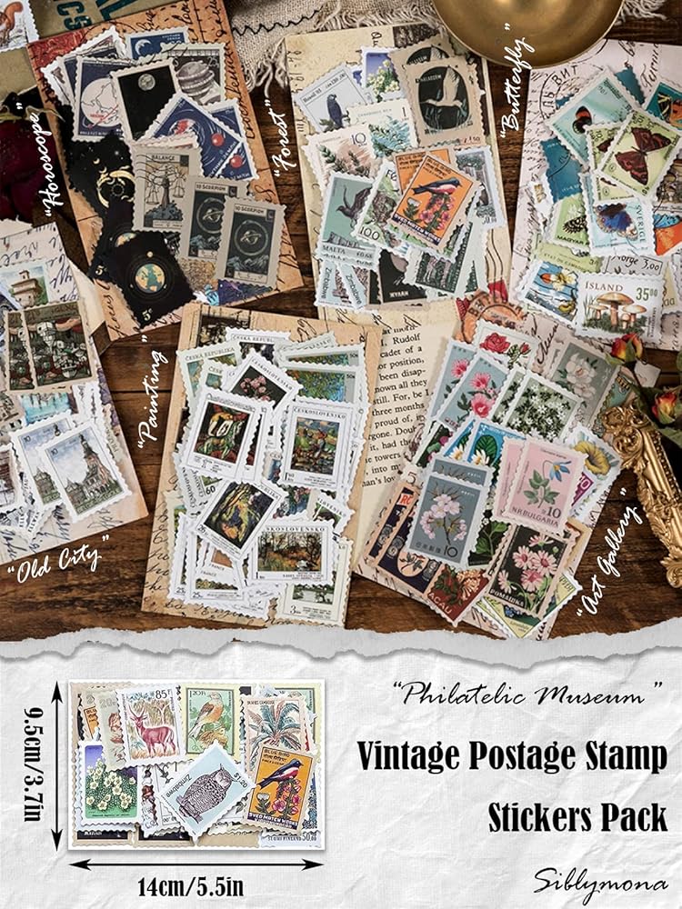 【Vintage Stamp Sticker Pack】—— This vintage stamp sticker pack is a collection of various themes, such as mushroom, flower, plant, grass, floral, herb, spice, bird, butterfly, landmarks, planets, moon, solar system and more.
