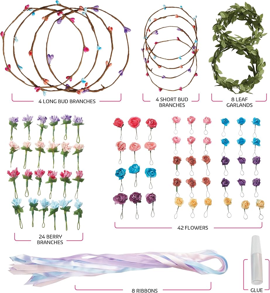Complete 90+ Piece Kit: Includes everything you need: 4 long bud branches, 4 short bud branches, 8 leaf garlands, 24 berry branches, 42 flowers, 8 ribbons, glue, and an instruction manual. All the materials and guidance required for creating stunning flower crowns and bracelets are provided.