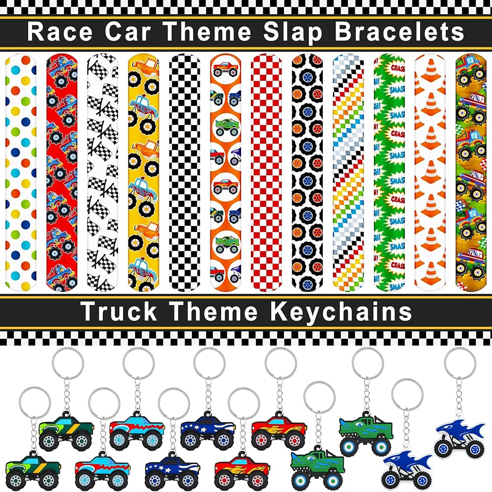 Monster Truck Party Favor Set includes 12 PCS Truck Theme Slap Bracelet, 12 PCS Truck Keychains, 12 PCS Tattoo Stickers, 12 PCS DIY Stickers, 12 PCS Truck Straws and 12 PCS Truck Party Gift Bags.
