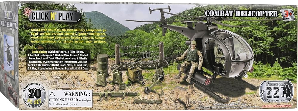 • MILITARY TOYS INCLUSIONS: 1 toy helicopter, 1 pilot, 1 soldier, 2 helicopter toy missile launchers, 2 anti-tank missiles, 1 rocket launcher, 1 barbed wire fence, 1 communications backpack, 1 bullet proof vest, 1 hand gun, 2 rifles, 1 land mine, 1 dog, 1 wooden crate with lid, 2 jerry can, 1 oil barrel.