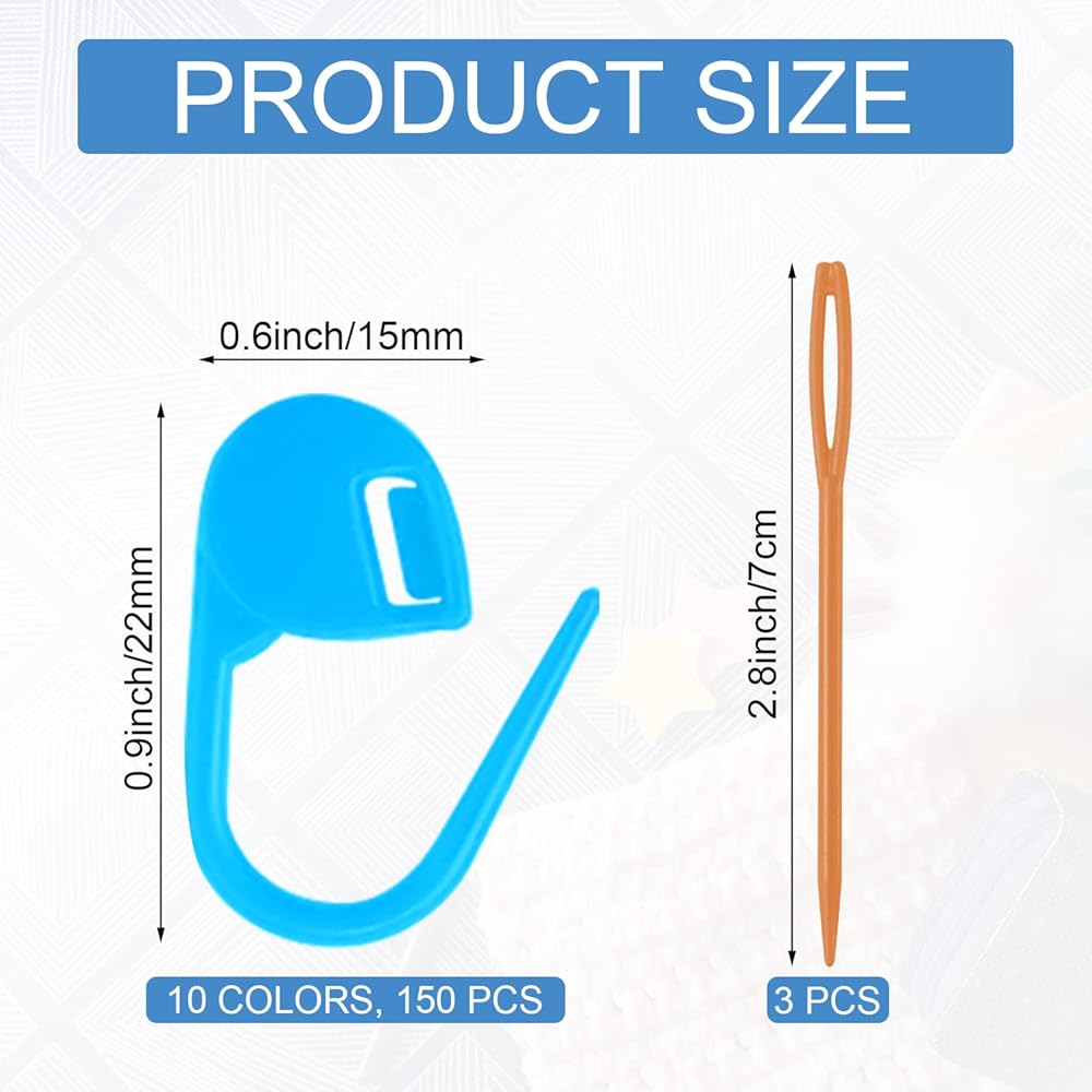 Package Content: You will receive 150 plastic suture needle clips in 10 colors, 15 for each color; 3 plastic blunt needles with large eyes, and its size is 7cm/2.8in.