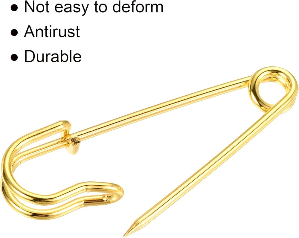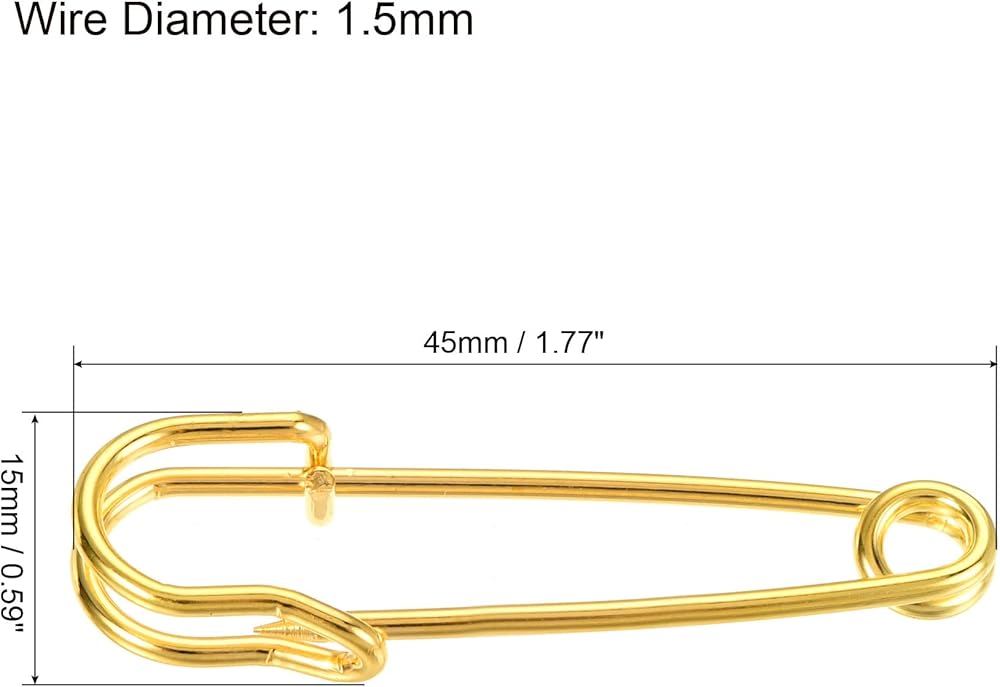 The safety pins, we provide here, is in the size of: Material: Metal; Color: Gold Tone; Size Type: Large; Overall Size: 60 x 15mm / 2.36 x 0.59 Inch(L*W); Wire Diameter: 1.5mm; In the package of: 15 x Safety Pins