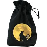 The color theme for this dice bag features a black background and a colored print of the cat in front of the full moon.