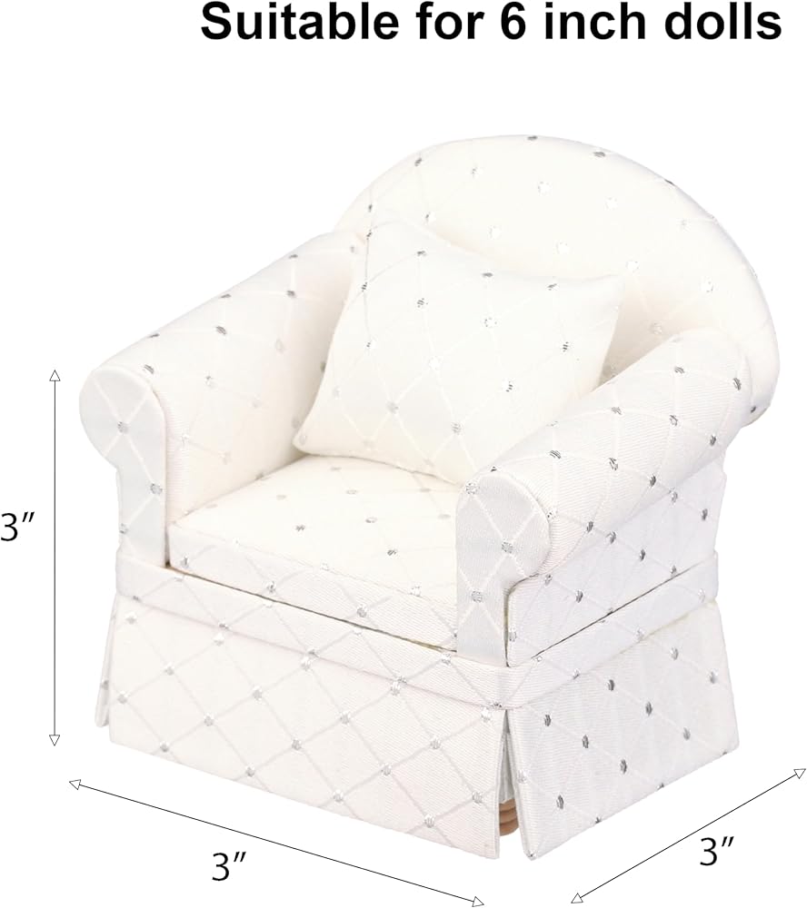 Inusitus White Dollhouse Armchair with Ottoman, Mini Living Room Sofa Chair, Furniture Accessory for 6 Inch Dolls, 1:12 Scale, Handmade Upholstered with Throw Pillow