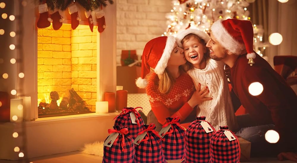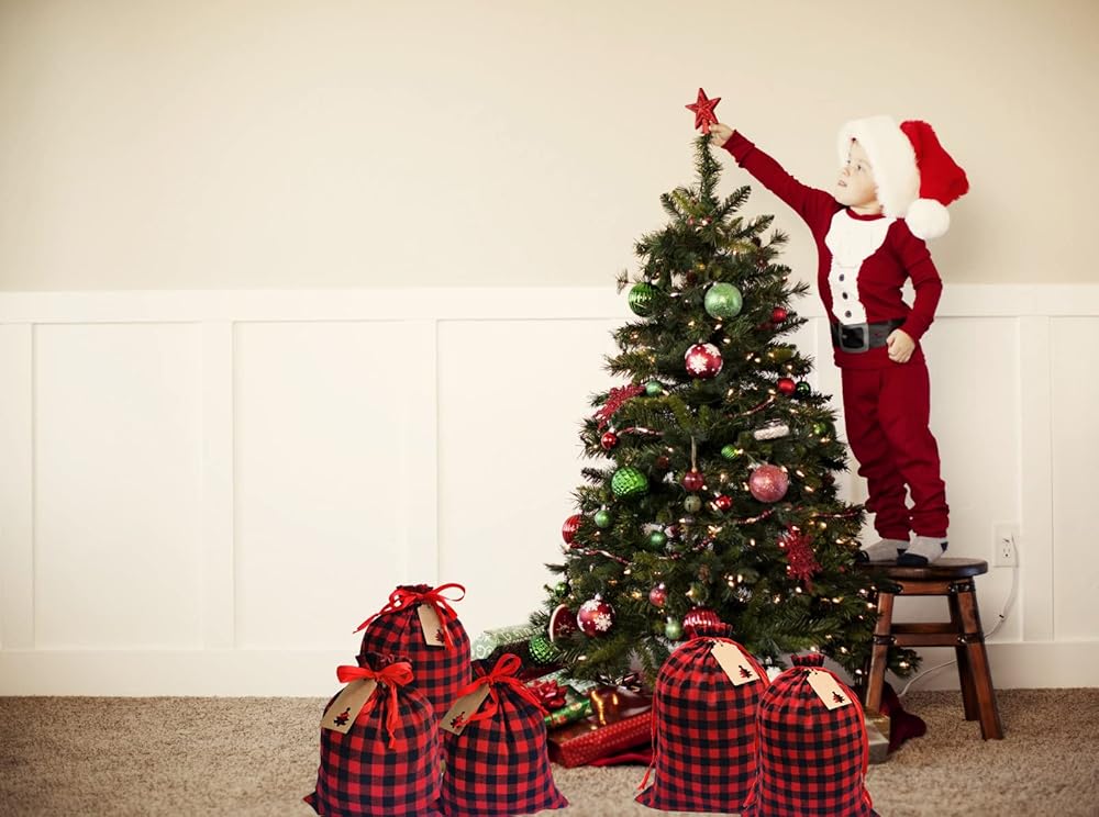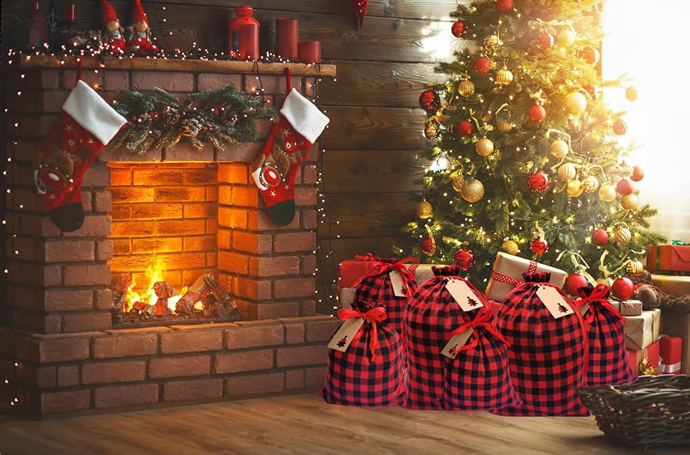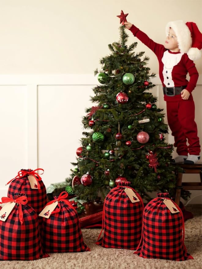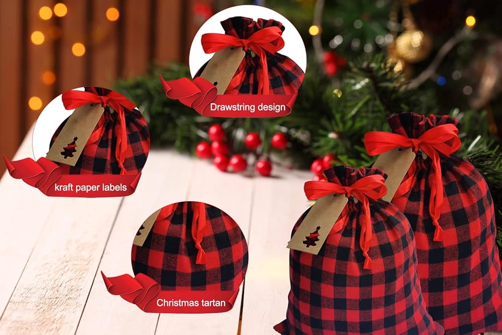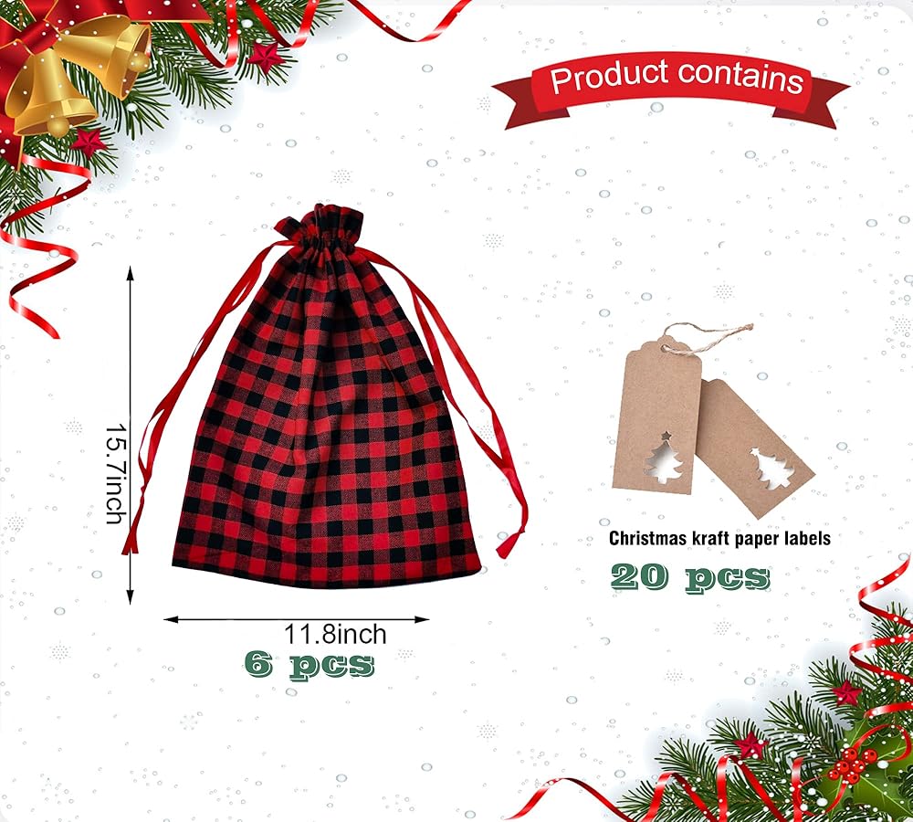 red and black plaid drawstring bags: you will receive a total of 6 Plaid Present Bag,15.7 x 11.8 inches,, 20 pieces Christmas kraft paper labels,You can write down names and wishes to give to family and friends, or even hang the tags under the Christmas tree.