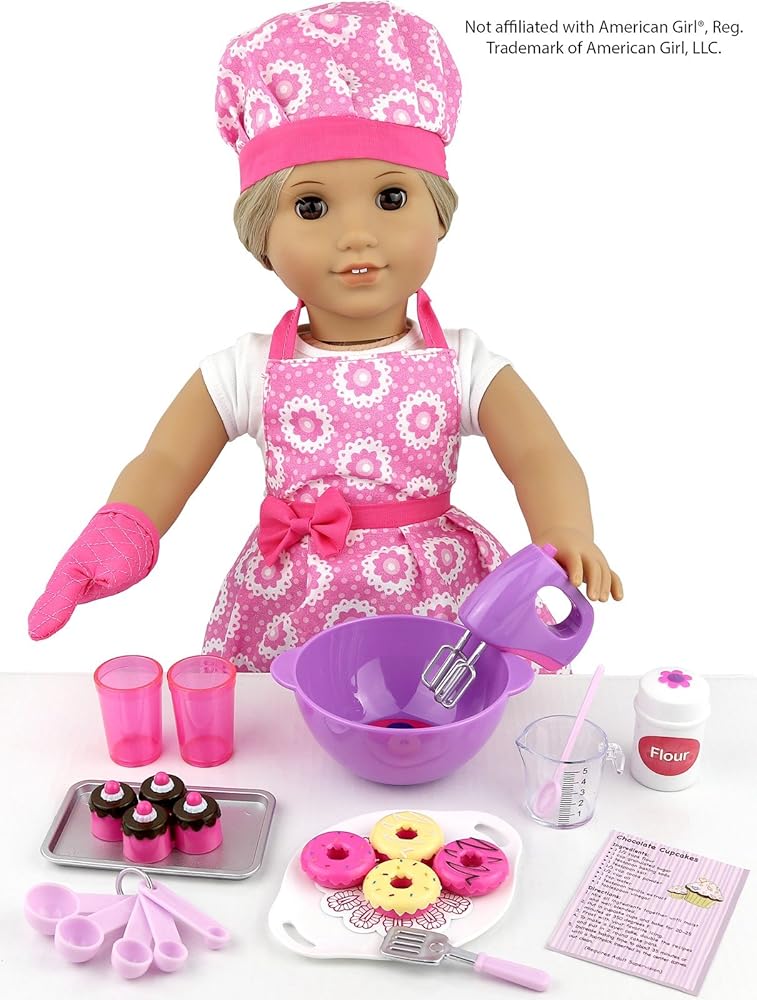 A great pretend play for your kids set comes with a variety of baking utensils and bakers clothing for dolls. This cute activity toy is a great way to encourage creative play and motor skill development. Compatible for 18 inch dolls like the American Girl.