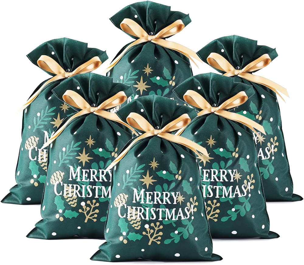 Fabric gift bags sets include 6 packs green Christmas drawstring gift bagss measure 12" x 18", dress your gifts for any special occasion with these merry Christmas gift bags