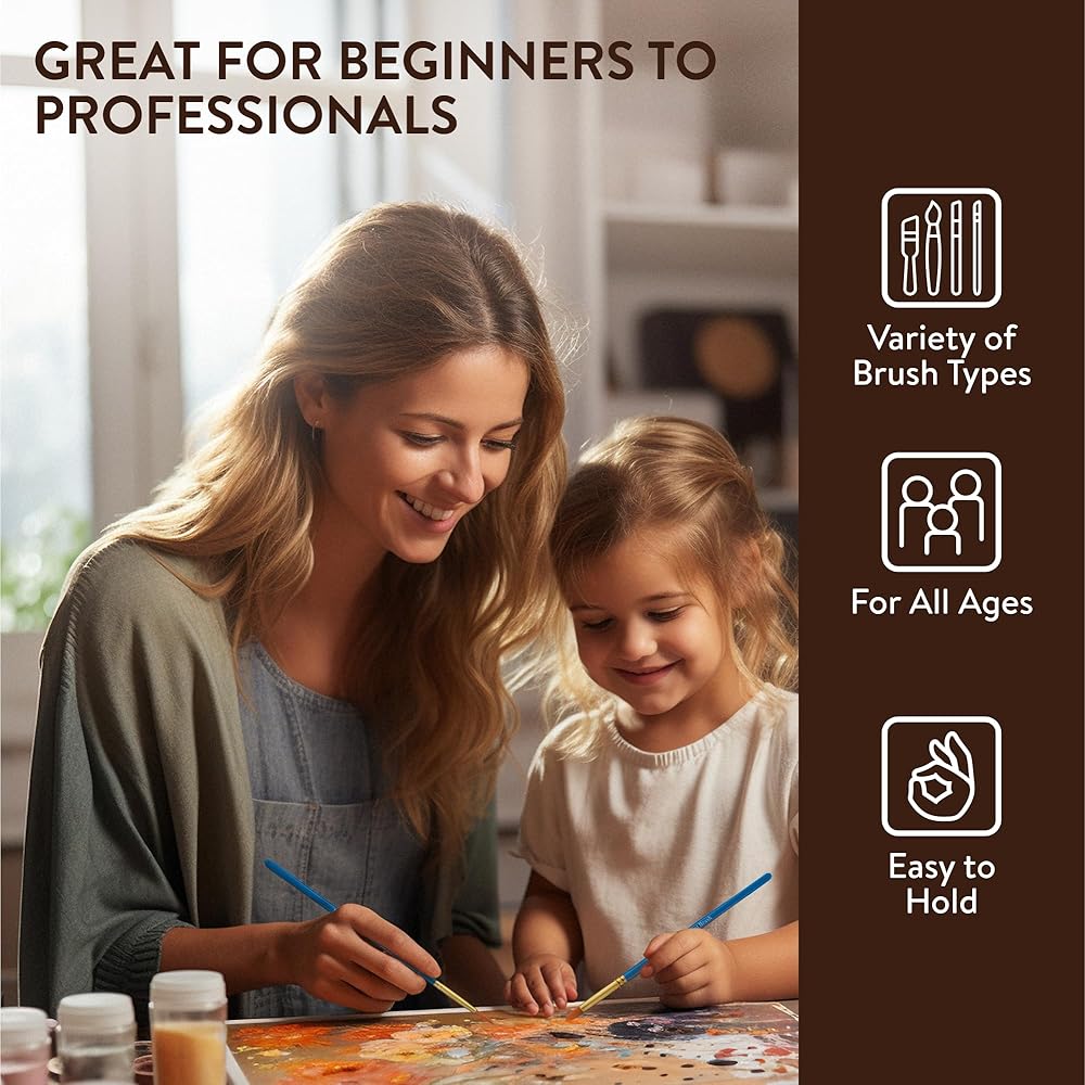 Our paint brushes for acrylic painting have square and flexible ends that allow you to make long strokes with perfect blending and painting with every type of color paint. The sturdy tip and sides can be used for more delicate lines and small touches. With our round and pointed watercolor paint brushes, which are capable of bold strokes you can cover large areas by rendering fine lines and details.