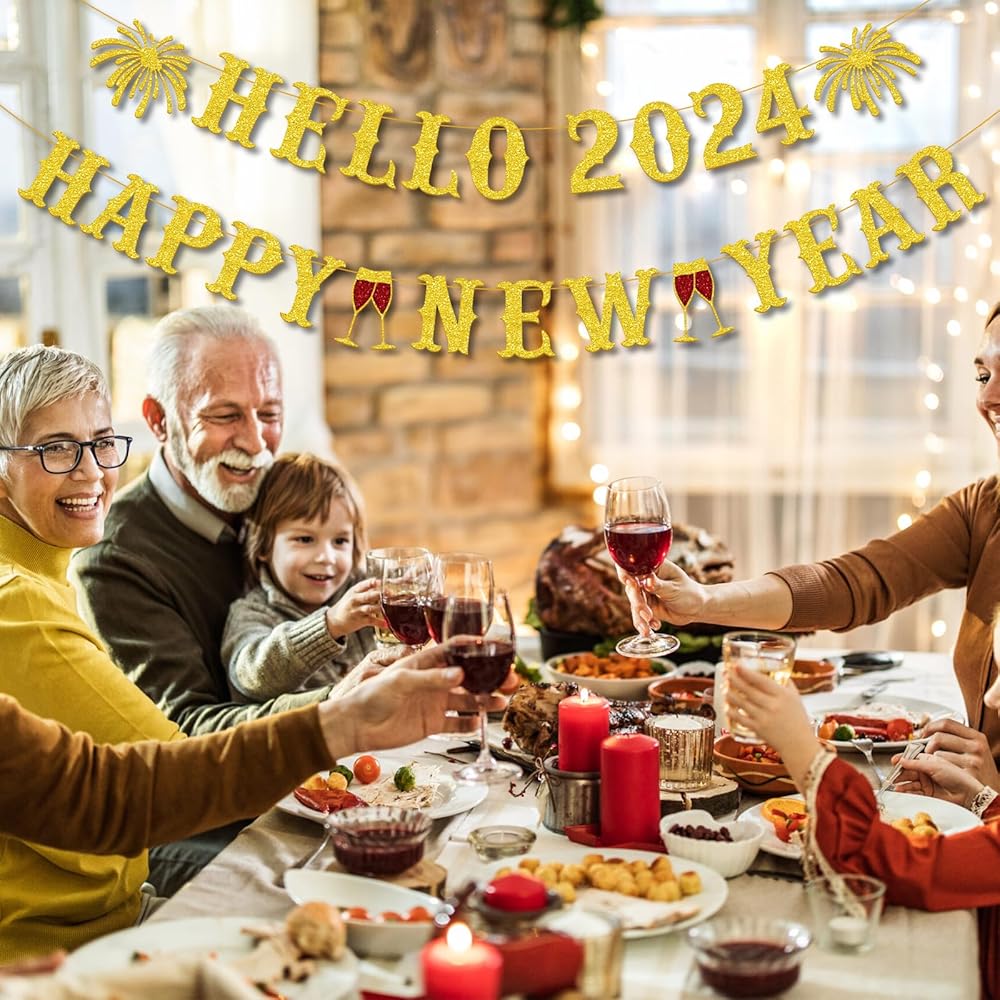 Gifloon Gold Glitter Hello 2024 Happy New Year Banner, Large New Year Banner for Happy New Year Decorations 2024, New Year Eve Banner Party Supplies 2024