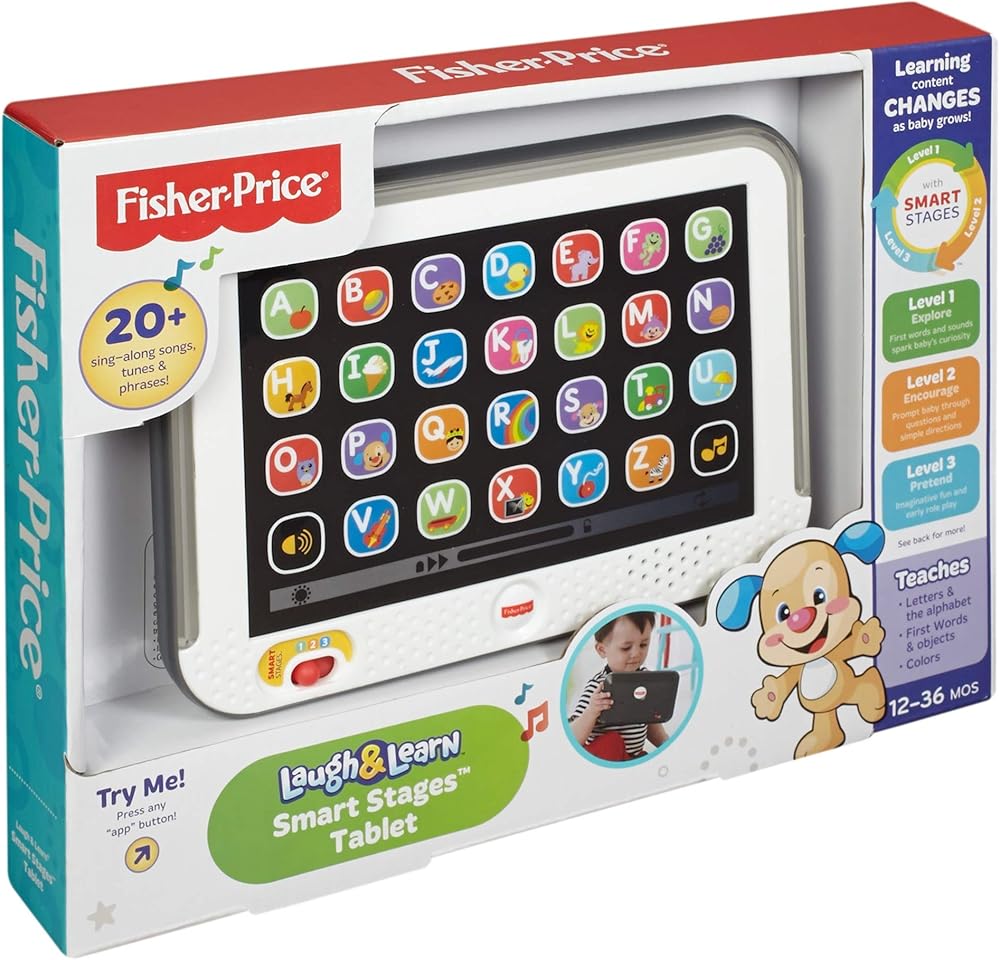 The Fisher-Price Laugh & Learn Smart Stages Tablet gives kids their very own pretend smart tablet with 28 "app" buttons to press and activate fun lights, sounds, phrases and music! This musical learning toy teaches infants and toddlers about letters, first words, animals and more through fun interactive play. And with Smart Stages technology, you can switch up the learning content as your baby grows.