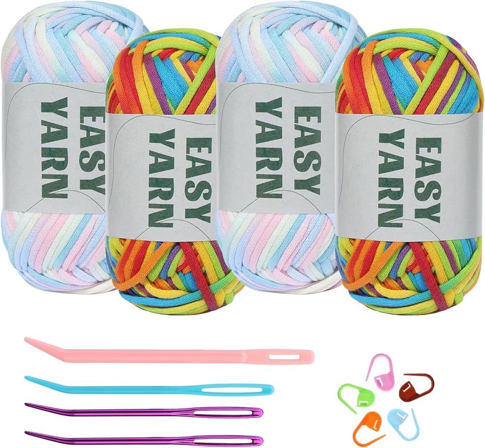 4x50g Rainbow Beginners Crochet Yarn for Crocheting and Knitting Crochet Knitting Yarn for Beginners with Easy-to-See Stitches Gradien Cotton Crochet Yarn for Beginners Crochet Kit