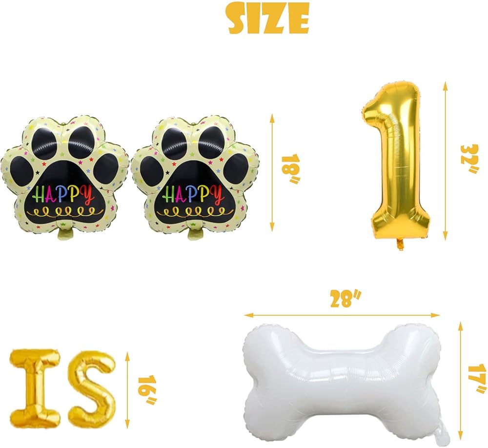 SIZE: Each Letter Balloons Size: 16", Number "1" Balloons Size: 32", Bone Shaped Baloons Size: 28" x 17", Dog Paw Balloons Size: 18".