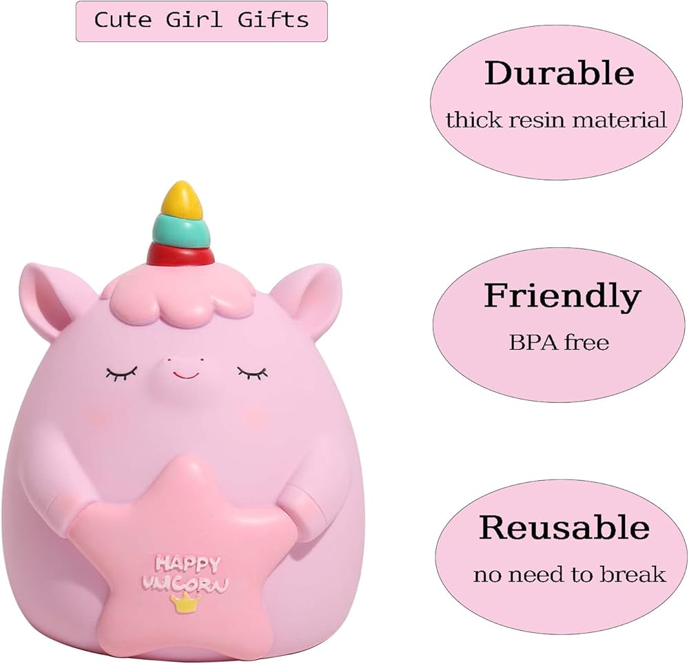 Our unicorn piggy bank material is non-toxic for health, made by rotocasted resin, it is unbreakable for use, more durable than regular plastic and resin piggy banks, kids might drop it many times without any damage.