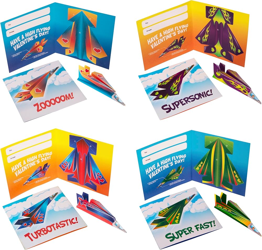 👍Package Includes : Our package includes 28 flying paper airplanes valentines cards for kids classroom comes in 4 different designs, 28 unique style pilot stickers, & 28 gift card envelopes for valentine's gift card exchange . The adorable & colorful pattern valentines day cards for kids school origami kit kids toys specially designed for kids to play with, let your child give more than a card. These kids valentines day cards mini gifts are sufficient for classroom or family kids.