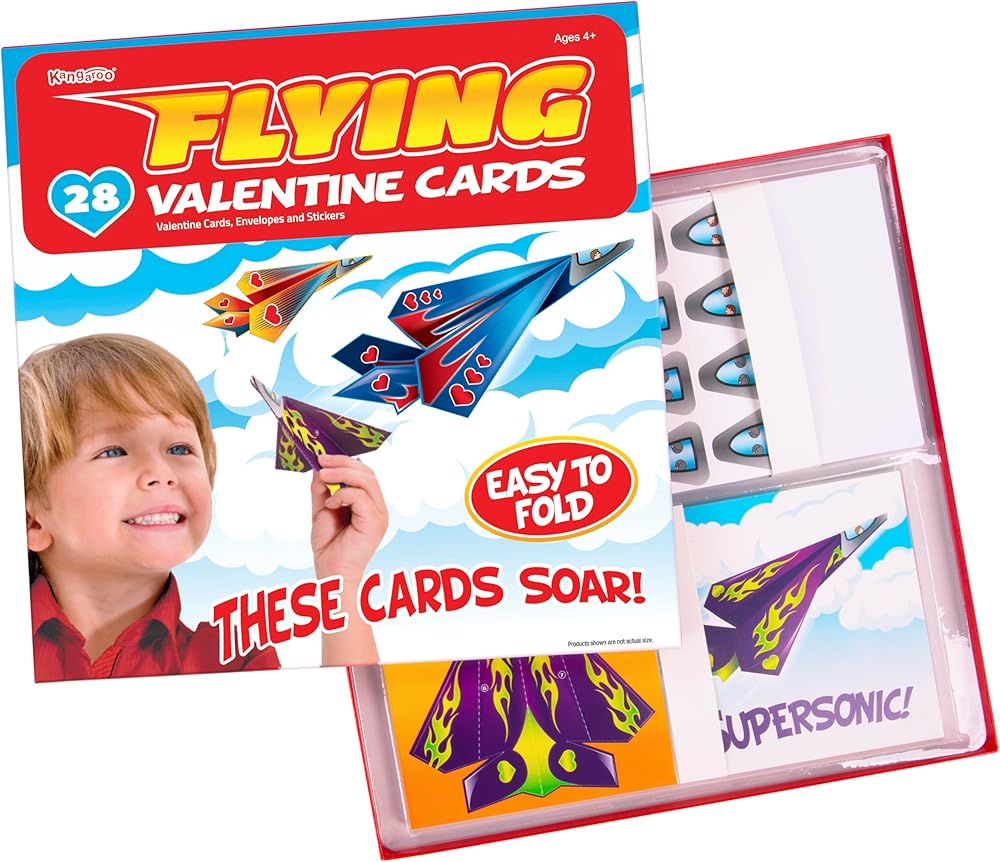 Kangaroo 28 Pack Flying Paper Airplanes Valentines Day Cards for Boy & Girl with Envelopes & Stickers - Valentines Day Cards for Kids School - Valentine Bulk Party Favors Classroom Gift