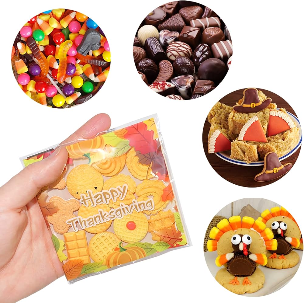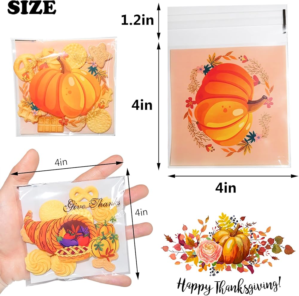 【Size】fall treat cellophane bags measure approx. 4X4 inches.Enough to put 10 or more pieces of candy and also great to store cookies, chocolates or other small snacks