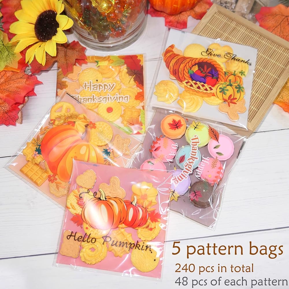 【SUPER VALUE PACK】240 pcs decorative fall Cookie and Candy Cellophane Clear Bag features 5 different designs.48 pcs of each.Enough quantity for your fall party use