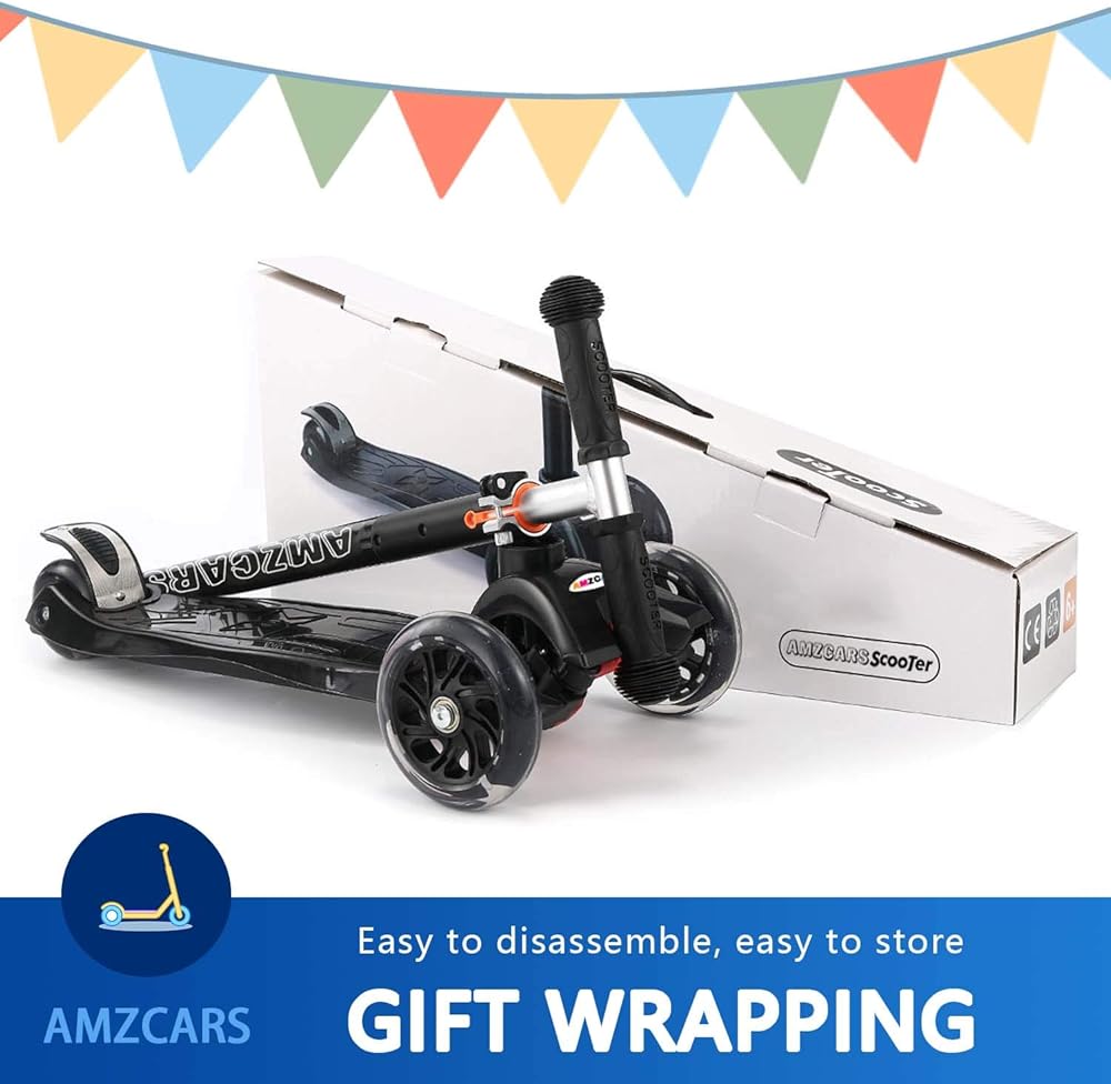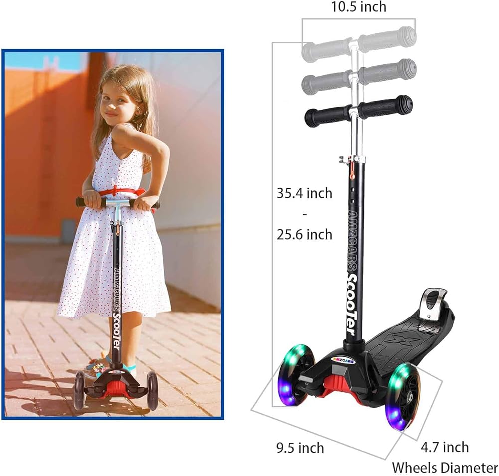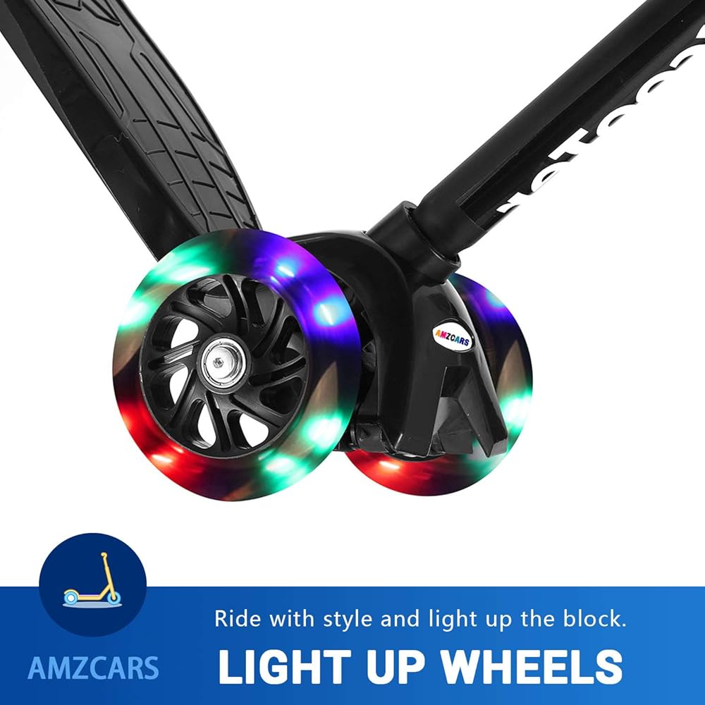 【Awesome Wide Flashing Wheels】The kids kick scooter features 2 big front PU flashing wheels and small rear flashing wheels. As you scoot the kick scooter, the turning wheels light up in a variety of flashing color, adding an original,super cool and fun twist to the ride.The wheel lights are powered by spinning without batteries required. Lights get brighter with the faster your kids go.The flash of rainbow colors is both an exciting attraction to kids and a safety guarantee for riding at night.