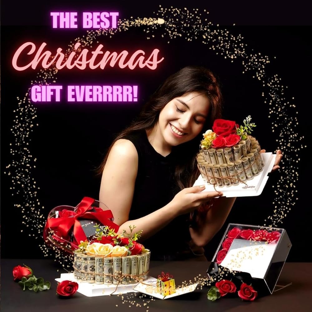 Flower Money Cake – Fake Cake Gift Box – Christmas, Birthday Gifts for Her and Him – Best Gift Ideas for Quinceanera, Sweet 16 Gifts for Girls – Surprise Money Box for Cash Gift Pull
