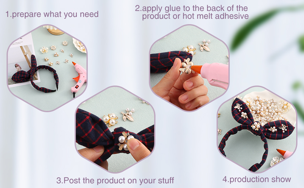 Embellishments Crafting Tip:If you receive a product and the pearl rhinestone falls off,Use a hair dryer to blow on the side with the hot melt adhesive.When the hot melt glue is soft, you can peel it off and use the hot melt glue again to continue using the product.