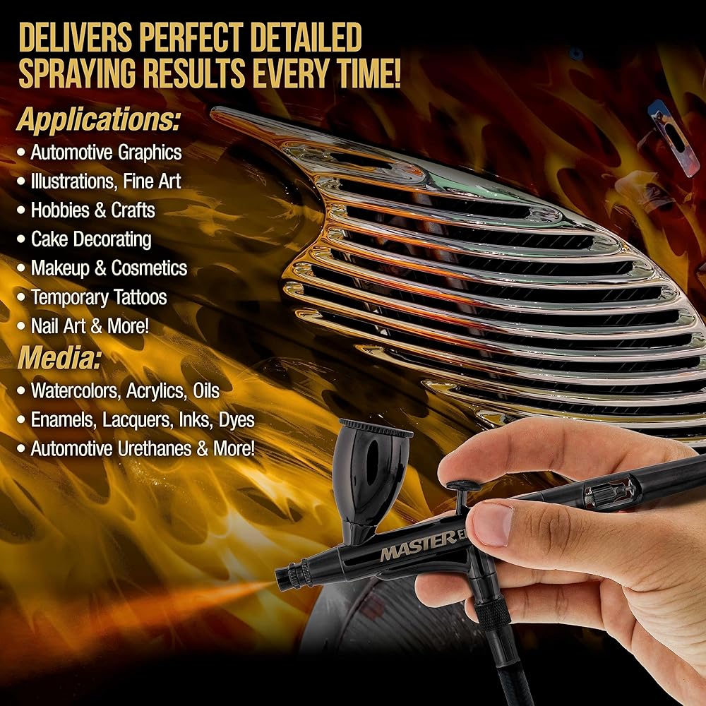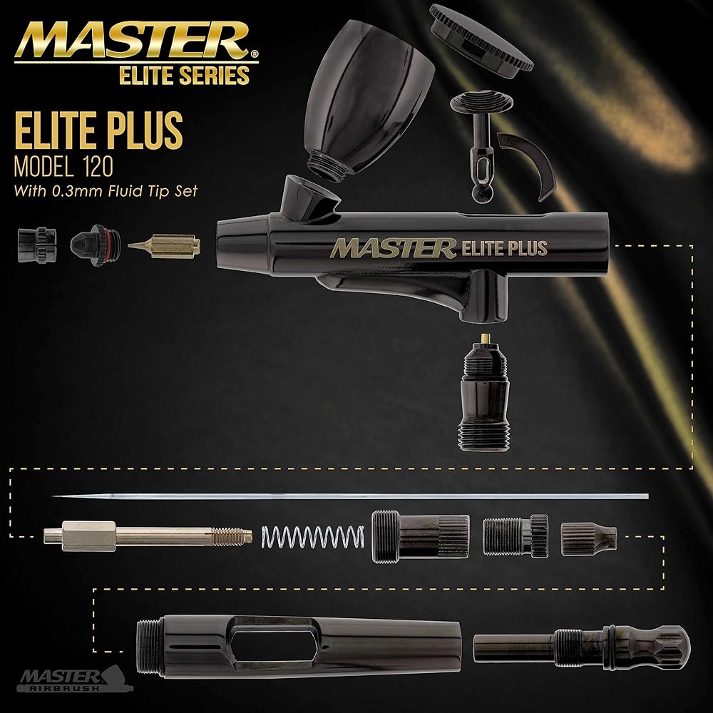 The Master Elite Plus Model 120 is a superior-quality airbrush that provides the user with an elite level of spraying performance. It's an airbrush designed with the PLUS features demanded by those who desire perfect results every time! A user-friendly, versatile, and durable finely-tuned airbrush built with the highest quality materials, so it always delivers consistent, extremely fine detail control.