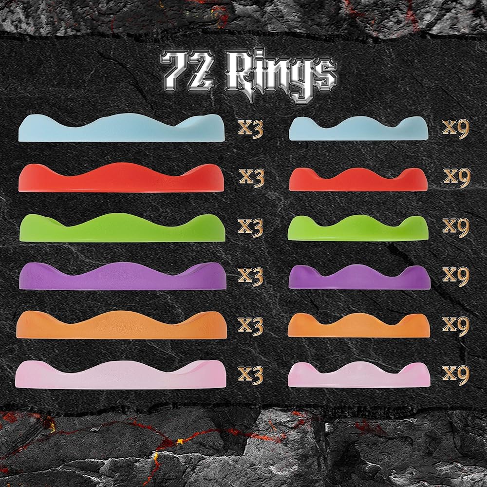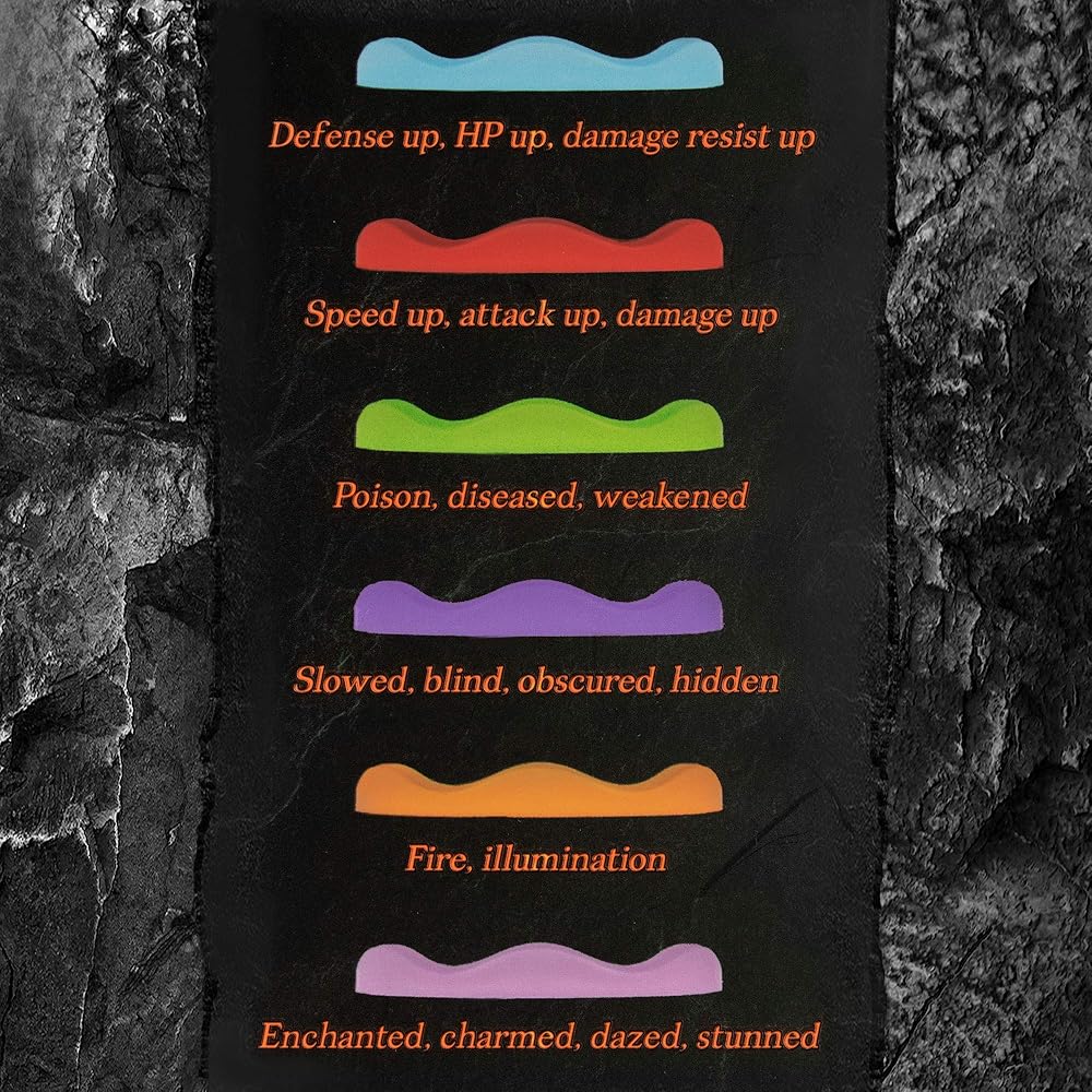 Equipped with 18 standard (25 mm) rings, and 54 mini (5 mm) rings, each color represents a different effect. Each Ring of Power box includes one insert with suggestions for each colored ring, but what each color means is ultimately up to you.