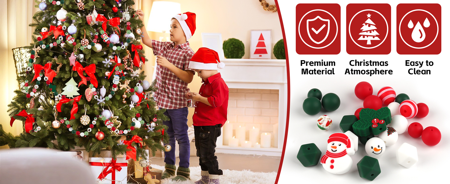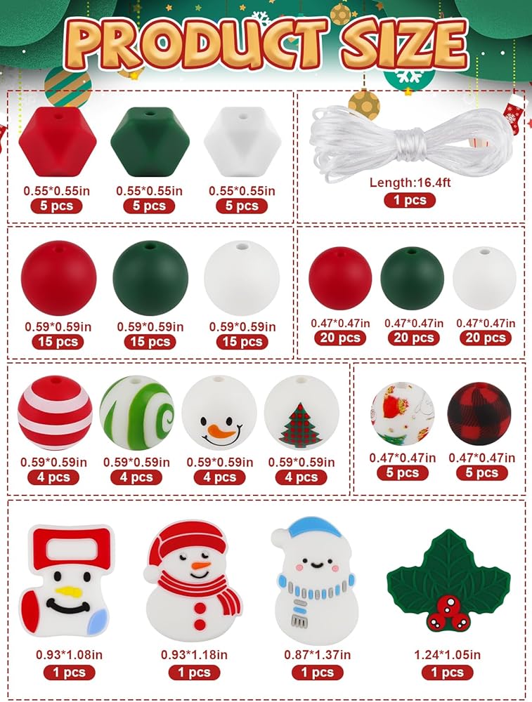 🎁 Package Include: You will receive a total of 5m ropes and 150 Christmas silicone beads, including 70pcs round 12mm silicone beads, 61pcs 15mm round silicone beads, and 15pcs polygonal 14mm silicone beads and 4pcs silicone beads with Christmas patterns design , the colors are based on the classic Christmas colors of red, green, and white, there are a variety of different styles of beads, which can satisfy your Christmas decorating and DIY needs.
