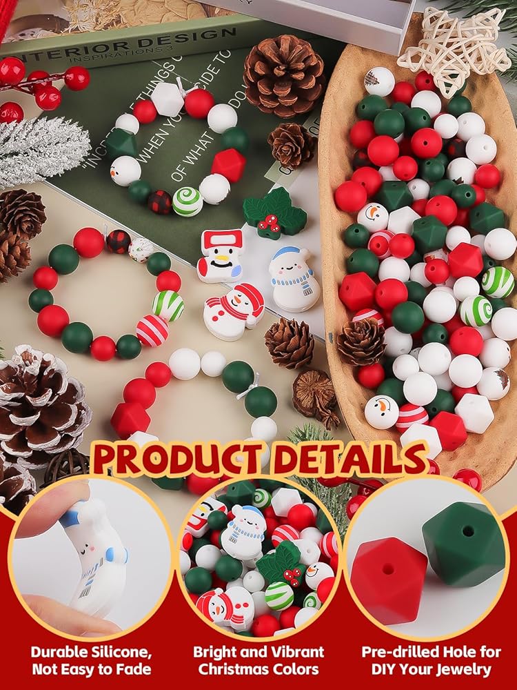 🎄 Have Fun with DIY: Red white green silicone beads have been pre-punched for your convenience, making it easy to create bracelets and other crafts. They are simple to use - just string them with matching threads according or add them to earrings, necklaces, keychains. With a wide variety of styles available in large quantities, they can meet all your decorative needs round beads ready to go and enjoy DIY projects with your family.