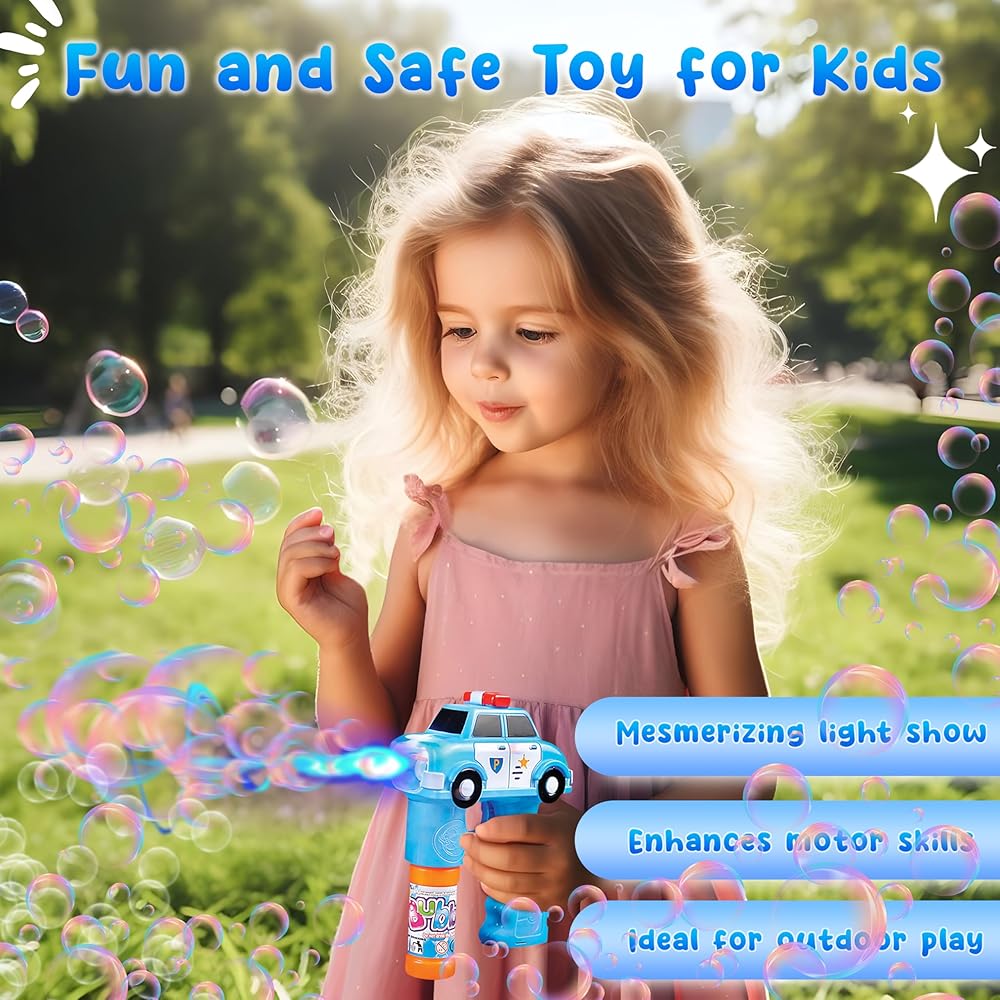 Step into a world of mesmerizing bubble magic with our 5" Light and Sound Police Cruiser Bubble Blaster! This incredible toy, designed as a police cruiser, shoots bubbles from the front of the vehicle, and makes siren sounds, honks and plays music, adding an extra element of excitement to the experience. Prepare to be immersed in a captivating spectacle as the vibrant bubbles and illuminating effects mesmerize both children and adults alike. With just a simple pull of the trigger, you can unleash an endless stream of bubbles that gracefully float and dance through the air, leaving everyone around you in awe.