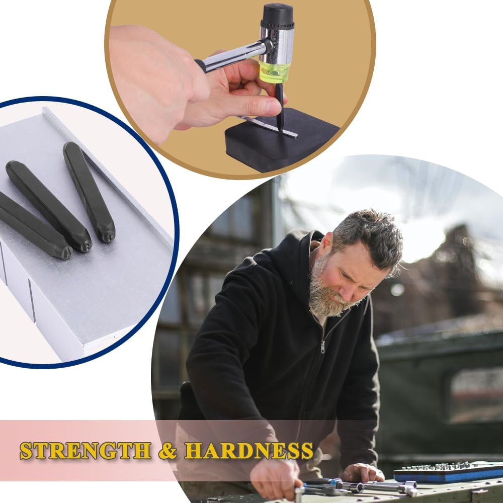 【يمكن استخدام الأسطح】 الفولاذ، والنحاس، والبلاستيك، والجلود، والورق، والألمنيوم، والفضي، والفولاذ المقاوم للصدأ وما إلى ذلك. استخدمها بمطرقة لنقش العديد من البيانات أو الأشكال التذكارية بشكل دائم (الاسم، الإضافة، التاريخ، إلخ) على المواد بما في ذلك حرفة المجوهرات. .
