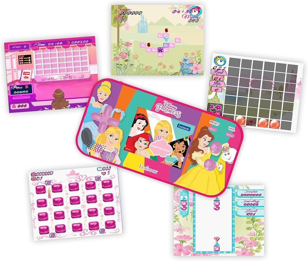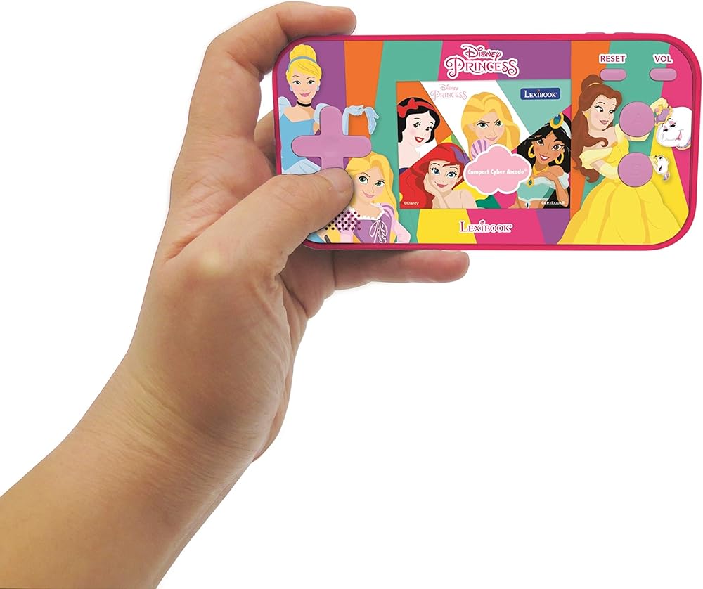 150-in-1: 10 Disney Princess games + 140 classic games : sport, action, logic, adventure, platforms and much more! Hunt monsters, escape dangerous zones, score goals, and win wild races, hours of fun for everyone! 2.5'' LCD colour screen (6,35 cm) 8-bit CPU with 16-bit graphics. Speaker and volume bouton Power supply: 3 x AAA/LR03 batteries (not included) Compact size to bring it everywhere! A great design with many Disney Princesses : Cinderella, Rapunzel, Bella and Ariel!
