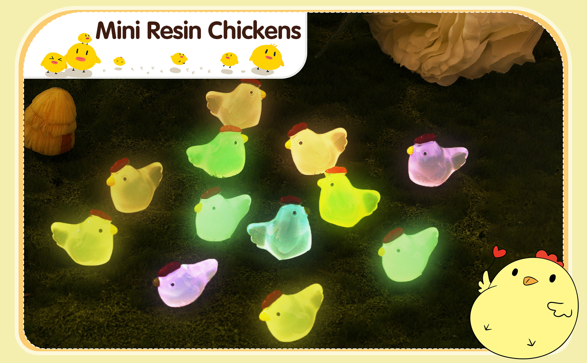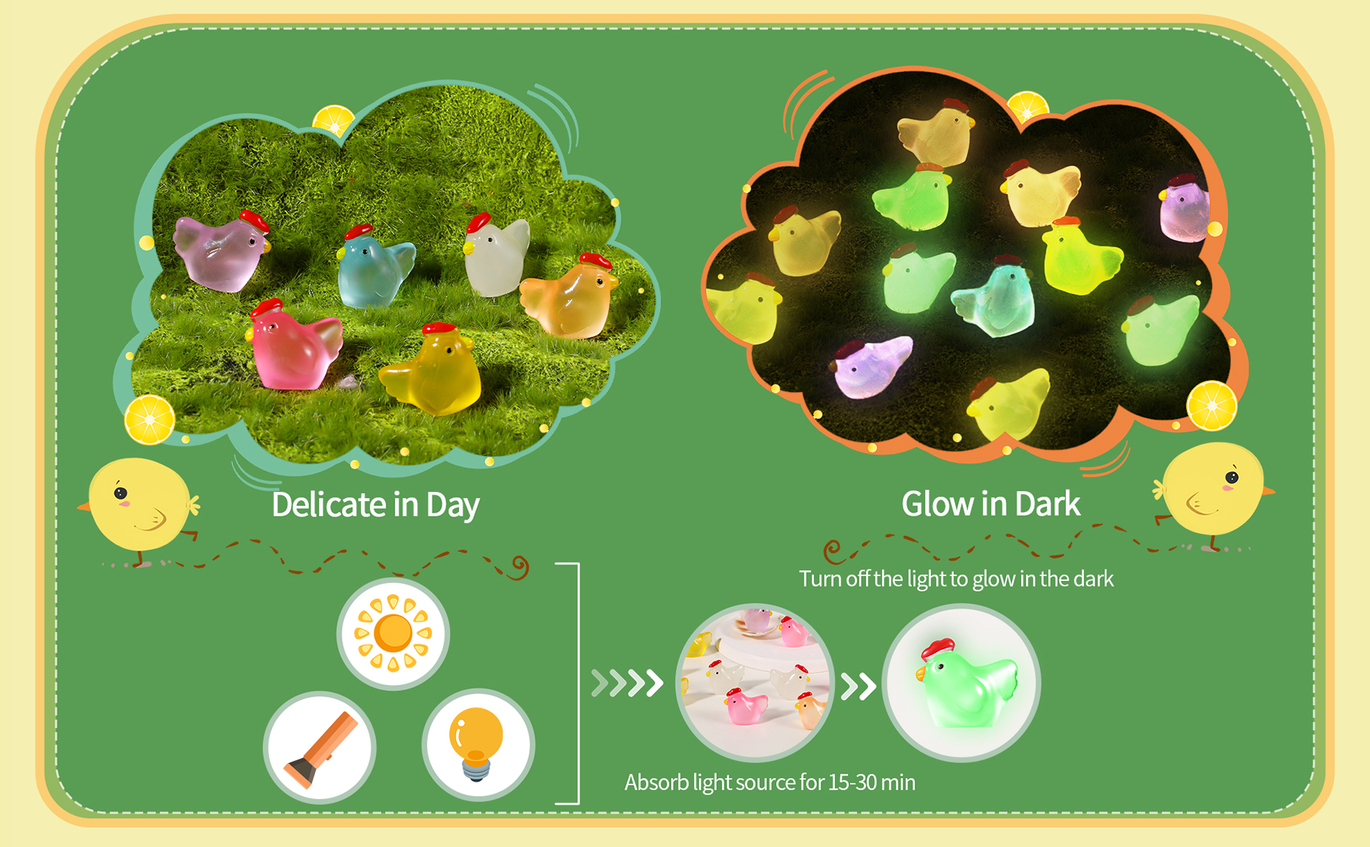 【Attractive Decorations】 -These little chicken has cute shape and luminous color to enhance attractive and interesting atmosphere of your room, dollhouse DIY, miniature garden landscape, fish tank, aquarium, plant and cake, they are charming decorations to attract others' attention!