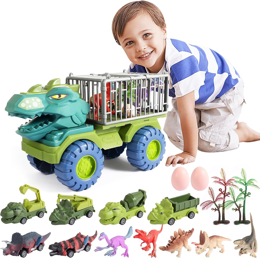 16 Pcs Dinosaur Truck Playset: This playset includes a large Tyrannosaurus head monster truck which has 4 big size wheels, 5 realistic dinosaur models, 6 friction powered dinosaur cars, 2 dinosaur eggs, 2 trees. All toys are made of non-toxic materials and are wonderful dinosaur toys for 3 4 5 6 7 year old kids.