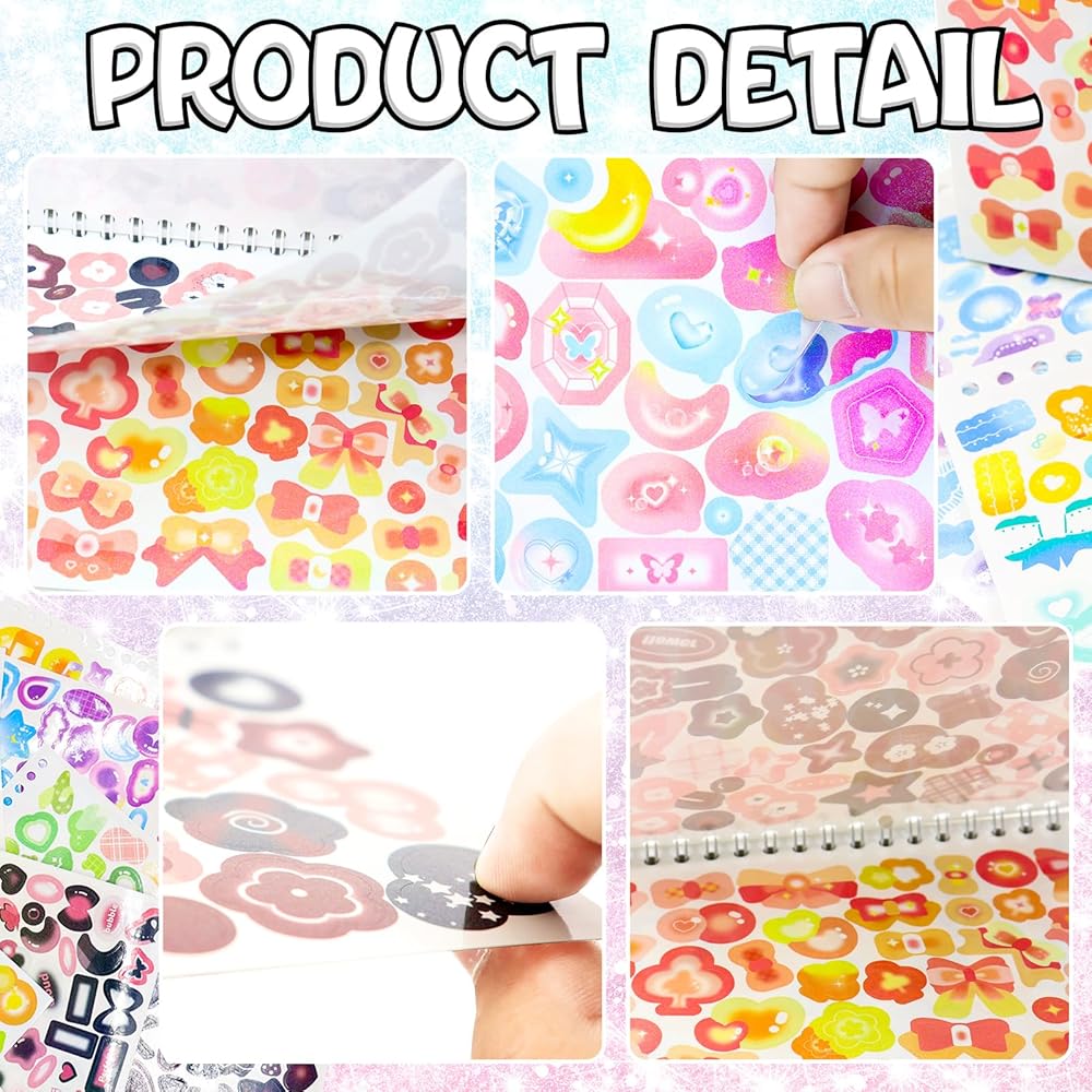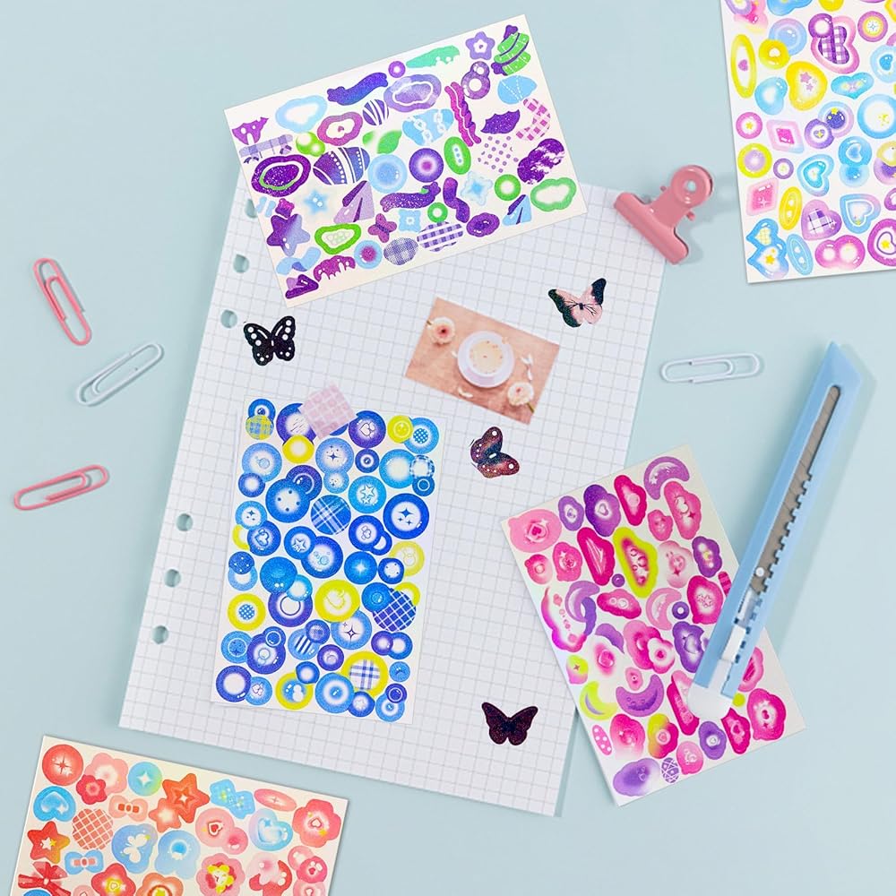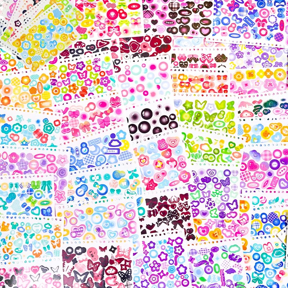 Unique and Variety: These cute korean stickers features distinct patterns and sizes, including stars, love hearts, moons, clouds, bowknots, butterflies, ribbons, and more, showcasing a shimmering and eye-catching appearance under light.