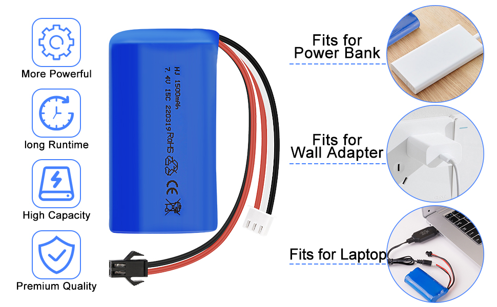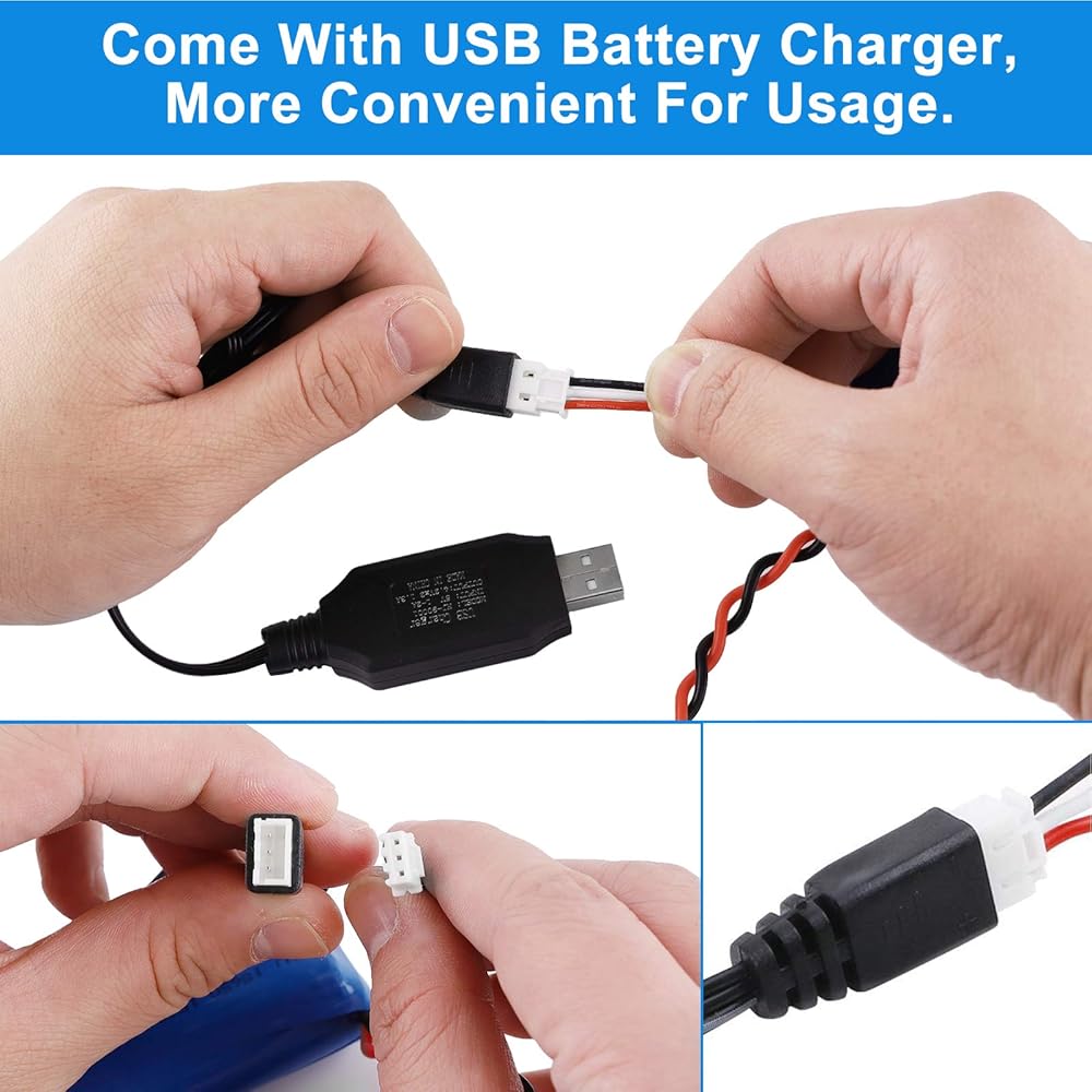 [Convenient for usage] - Packge includes 2pcs 2S 1500mah 20C li-ion battery and 1pcs USB battery Charger. With USB charging cable,you can charge batteries with any household adapter comes with USB port,like mobile phone charger,power bank, laptops, easy to plug in and out.