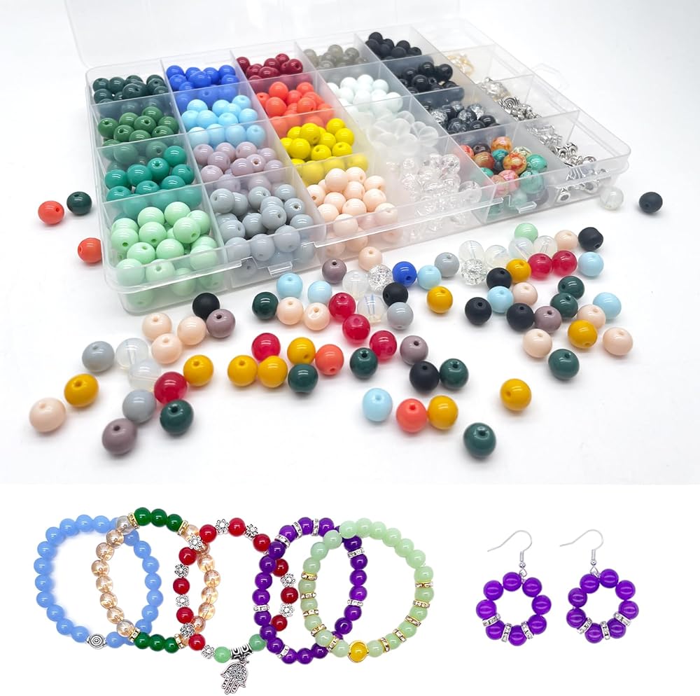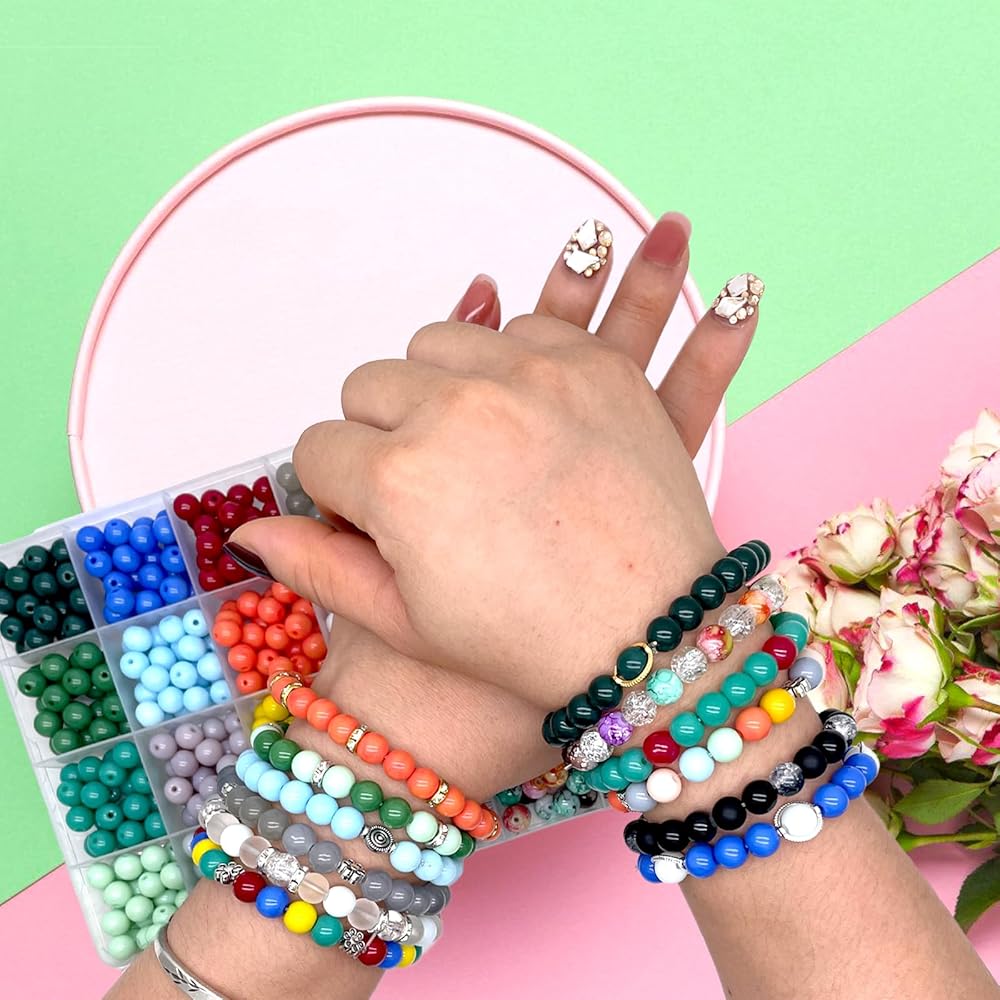 [All-in-one Bracelet Making Kit] The jewelry making kit includes about 600 pcs 8mm beads, 24 colors glass beads, 5 pcs silver cute pendants charms, 30 x silver spacer beads, 20 x rondelle spacer beads(gold/siver), 10 x ring spacer beads(gold/siver)2 x clear elastic jewelry sting, 1 x mini bead boards for jewelry making