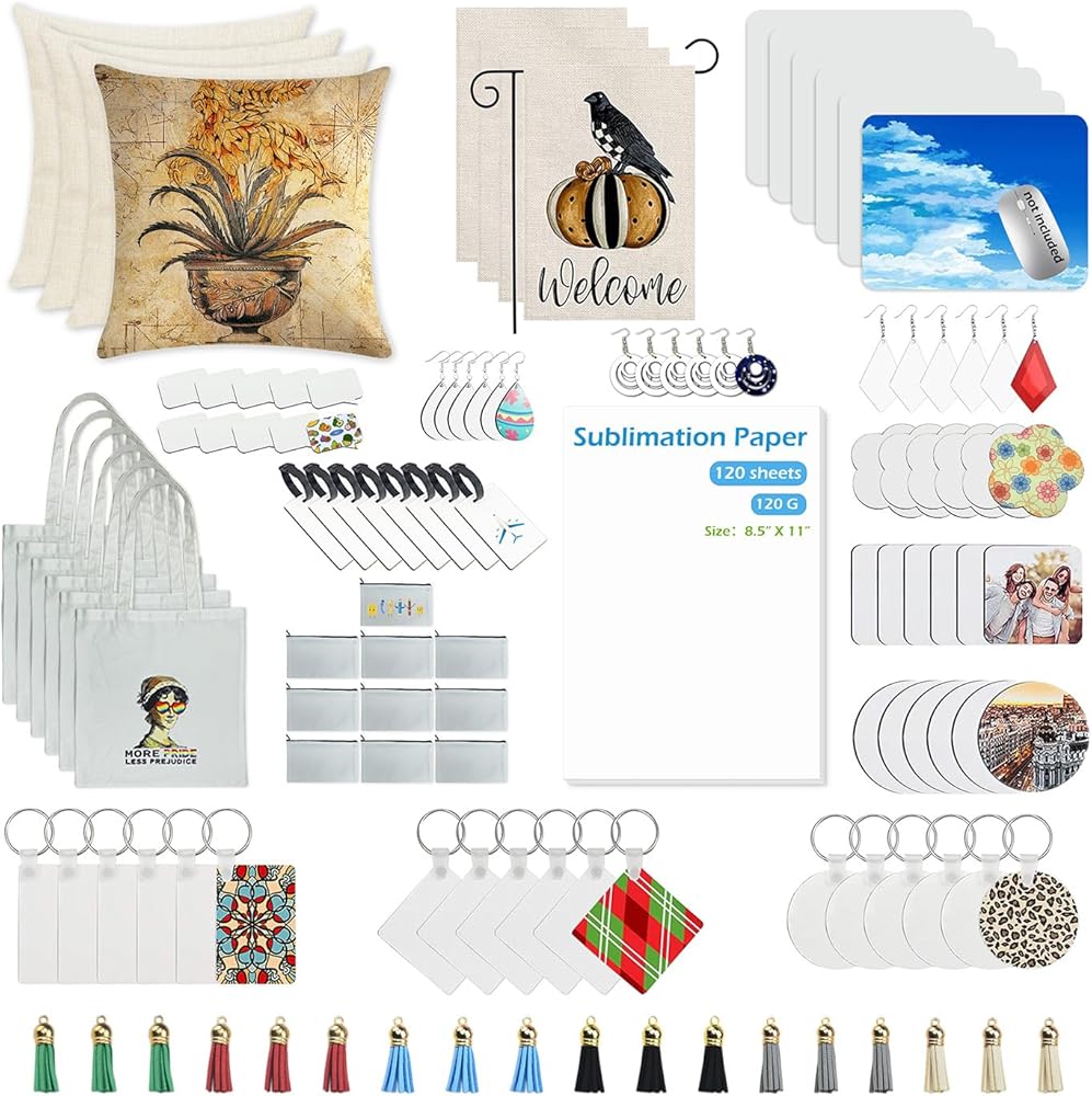 Sublimation Blanks Product Set: The package includesSublimation Paper 11x8.5In 120 Sheets 120G, 10 Makeup Bag, 6 Tote Bags, 6 mouse pads, 4 garden flags, 6 pillow covers, 24 keychains, 18 cup coasters, 18 pairs of earrings, 10 Fridge Magnets, 8 travel tags, this set includes many practical items in life, that fully satisfy your DIY needs.