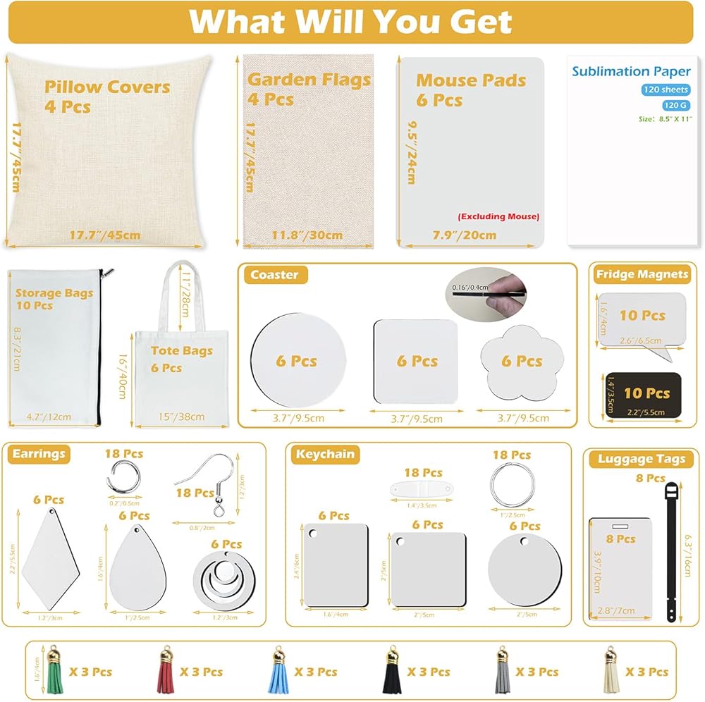 The package includesSublimation Paper 11x8.5In 120 Sheets 120G, 10 Makeup Bag, 6 Tote Bags, 6 mouse pads, 4 garden flags, 6 pillow covers, 24 keychains, 18 cup coasters, 18 pairs of earrings, 10 Fridge Magnets, 8 travel tags, this set includes many practical items in life, that fully satisfy your DIY needs.
