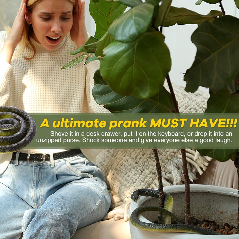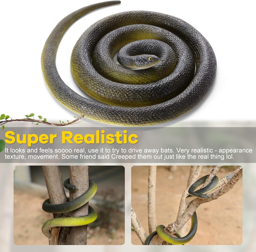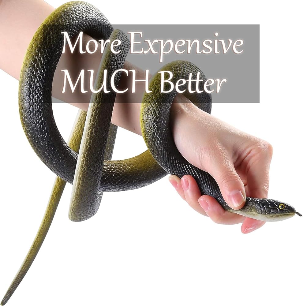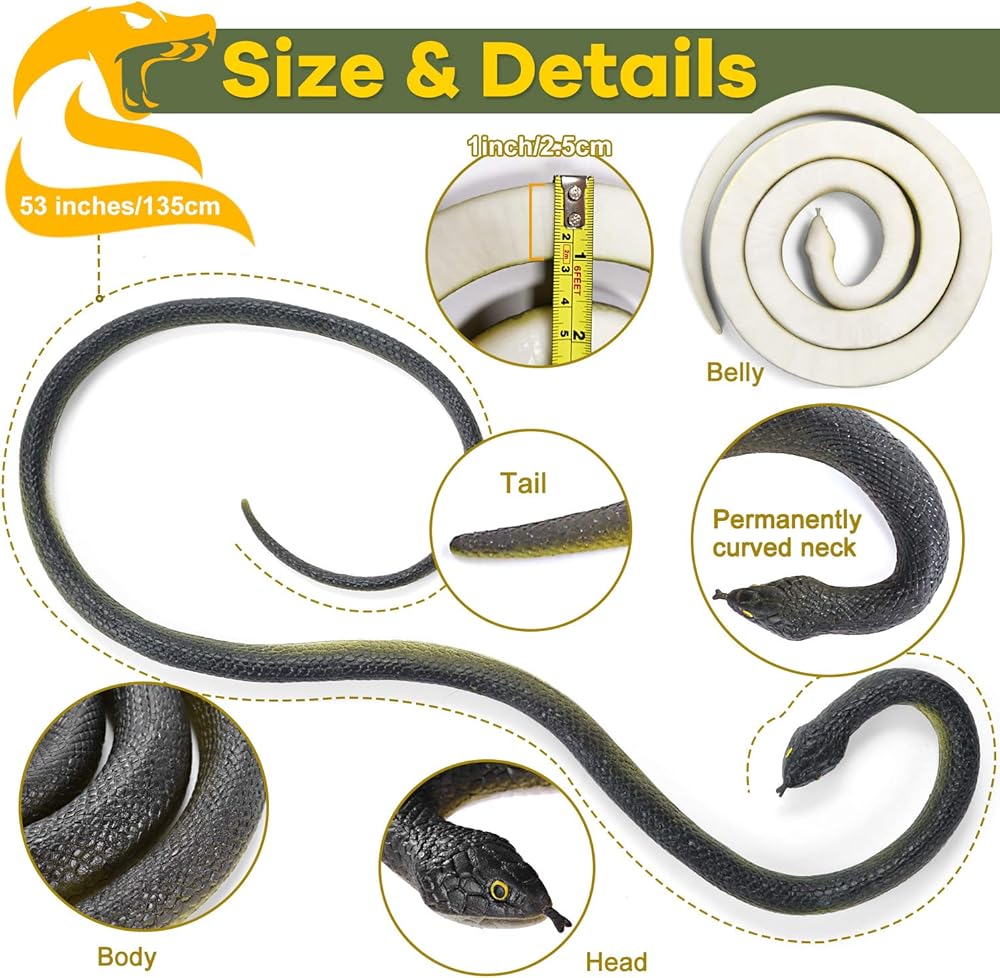 🐍[Realistic Snake&Excellent Appearance]: Made of high-quality rubber material, non-toxic and eco-friendly. Our realistic fake snake is very durable, sturdy, and stretchy. The quality and texture of our toy snake is excellent, and the color is Long-lasting. The glossy dark green skin and white belly make our Large rubber snake more lifelike! Get it without worrying about Fading.