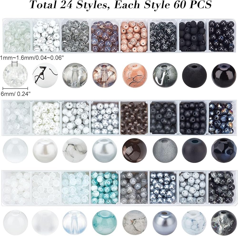 PH PandaHall 1440pcs Black White Glass Beads for Jewelry Making, 24 Color 6mm Round Spacer Loose Beads Craft Beads for Eid Mubarak Ramadan Decoration Bracelets Necklaces Earring Making