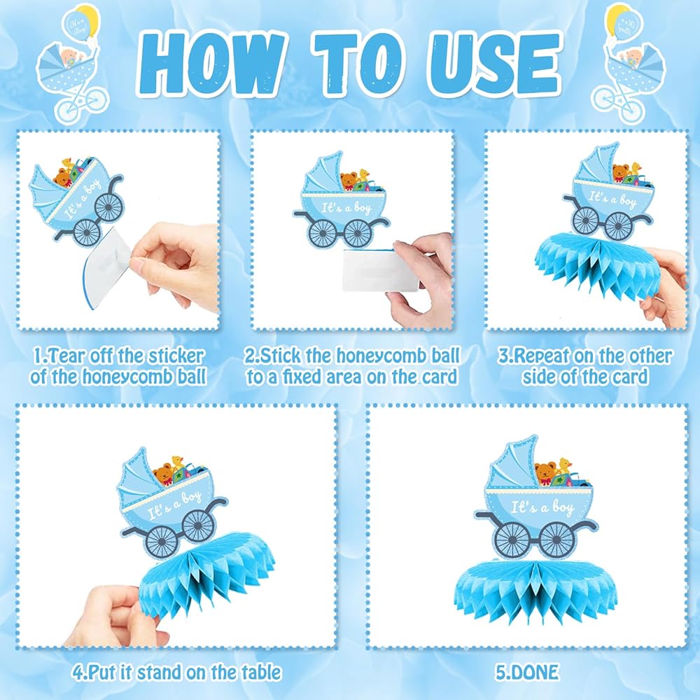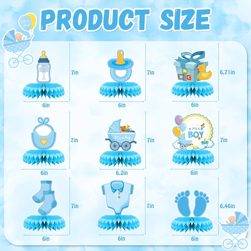 Cute Baby Boy Shower Decorations - 9 pieces of boy baby shower decorations includes 9 blue paper honeycomb balls and 9 full-size lovely it's a boy theme cardboard with non-repetitve design. These big blue baby shower decorations for boy are made with lightweight and well-printed materials to create a beautiful and adorable centerpiece for your baby shower table. The colorful design adds a fun and playful touch to your party decor.