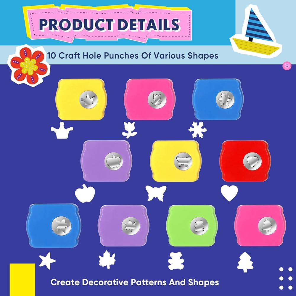Punch to Different Patterns: the hole puncher has 10 different patterns, including crown, butterfly, rose, Christmas tree, bear, maple leaf, apple, snow, pentagram land heart shape; The scrapbook scissors are made of diverse colors, they are attractive and cute, easy to get the kids interested