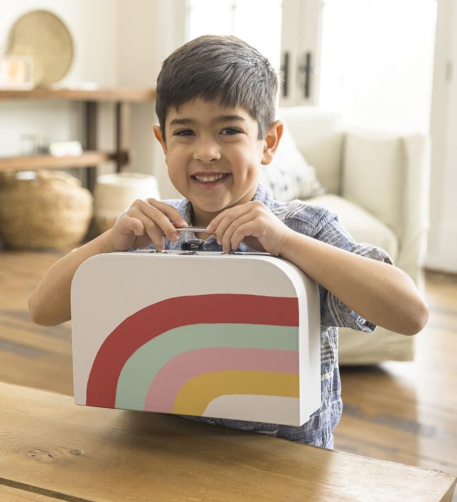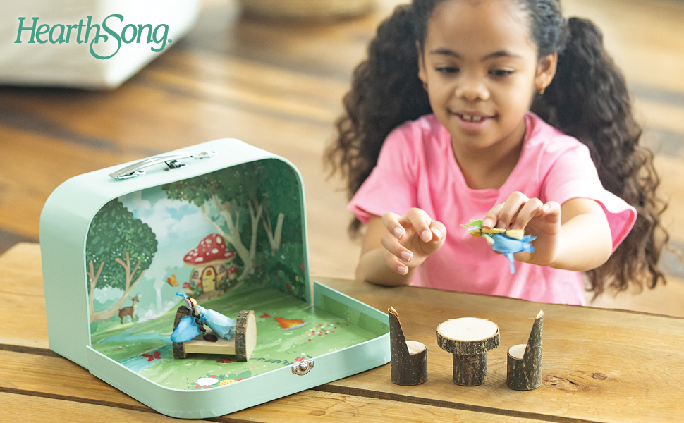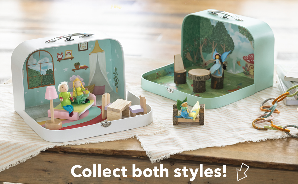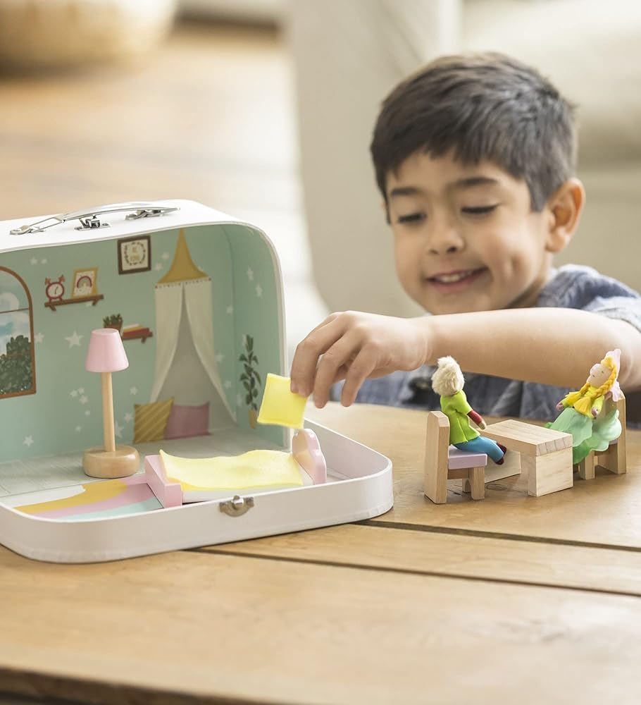 COMPLETE PLAY SET: Everything your toddler needs for imaginative play is tucked inside this 11½"L x 3½"W cardboard locking suitcase dollhouse: 2 dolls (each approx. 4"H) and 5-piece furniture set (2 chairs, table, bed with linens, and lamp). Open the dollhouse for a full play set area.