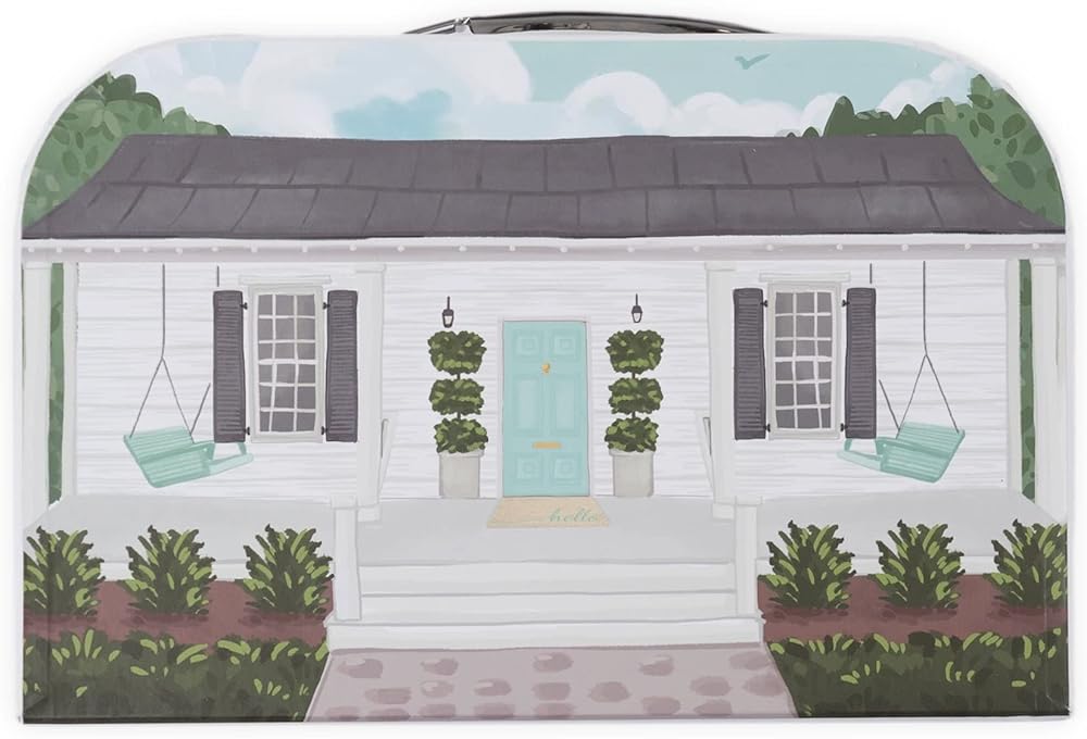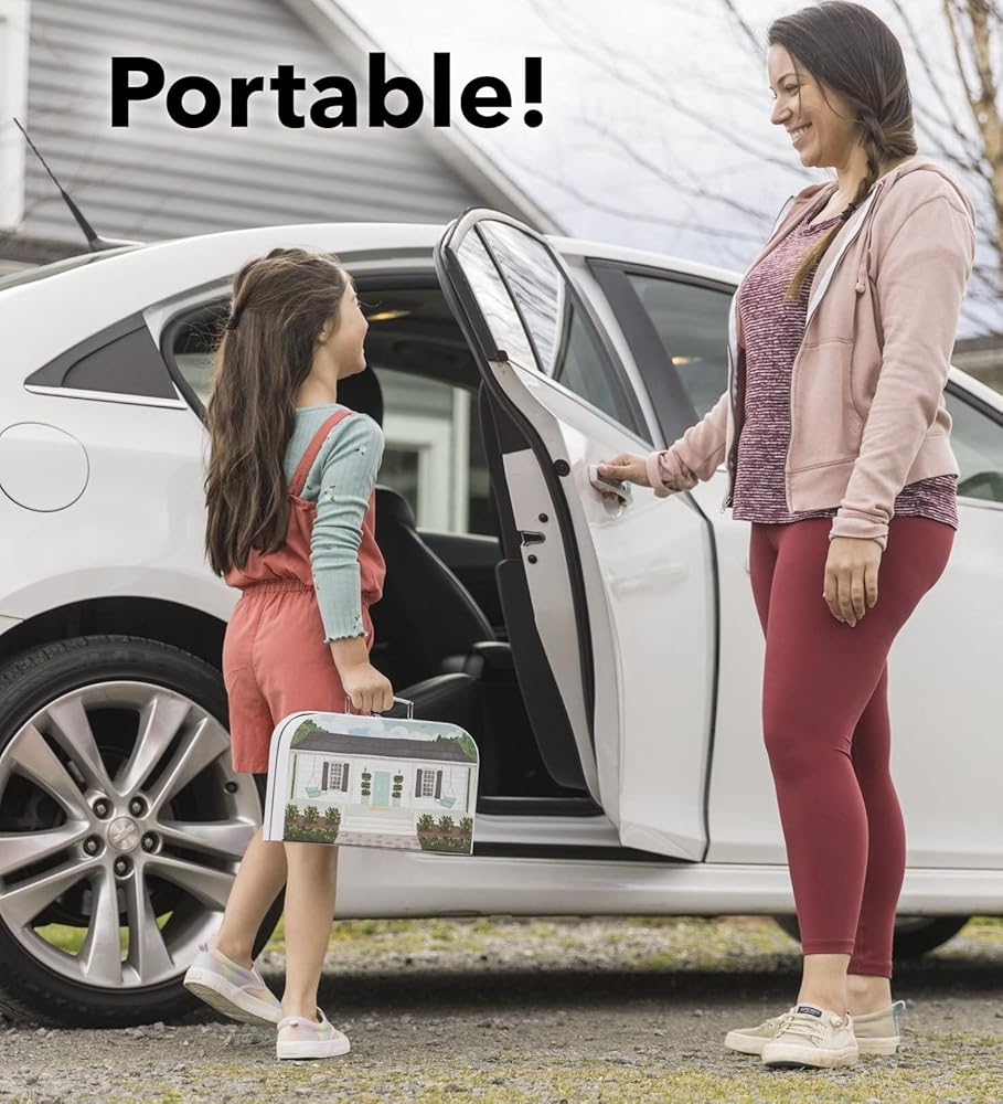 PORTABLE PLAY: Handle and locking latch make this portable play set perfect for long car rides, family vacations, or visits at grandma's house; every piece packs neatly inside the cottage-themed travel dollhouse.