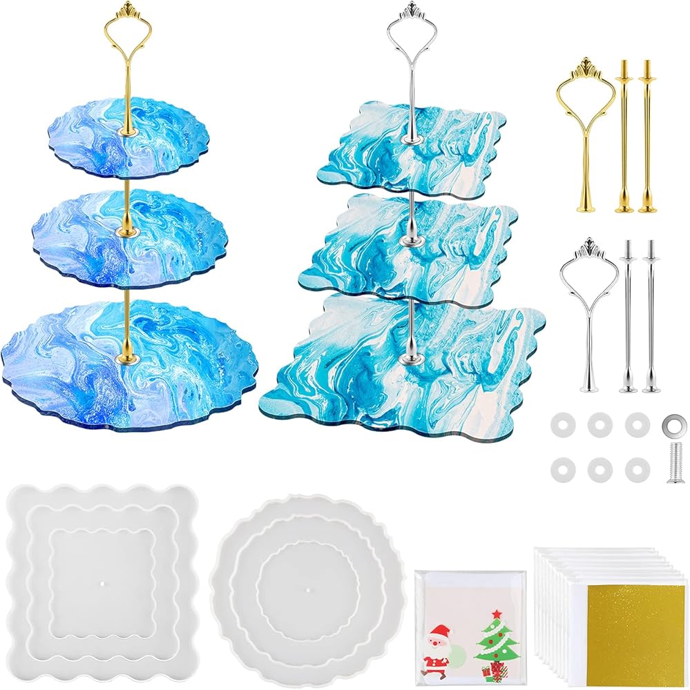 مجموعة من قطعتين من قوالب صينية الكيك المصنوعة من الراتنج من 3 طبقات، قالب صينية كيك من السيليكون مع 6 قطع من دعامات التاج و10 رقائق ذهبية، قالب صب الراتنج بنفسك لصنع طبق الحلوى، حامل تقديم (دائري + مربع)