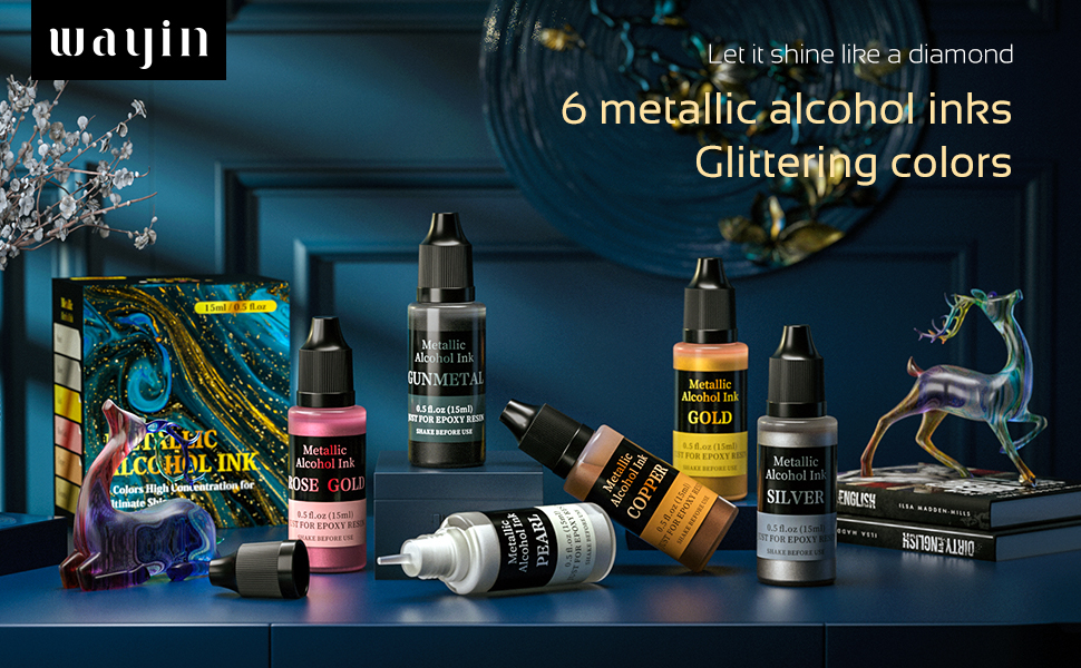 🌟【WIDE APPLICATION EPOXY RESIN ALCOHOL INK】: Wayin metallic Mixatives with Extreme Shimmer Alcohol-Based Inks mainly used for resin art, tumbler making and fluid art painting. It can create stunning effects, delicate layers and glitter colors or great depth of colors. It also applied to yupo paper and other non-porous or semi-porous surfaces including ceramic, glass, leather, metal, plastic, cardstock, canvas, vinyl, rock painting& coloring.