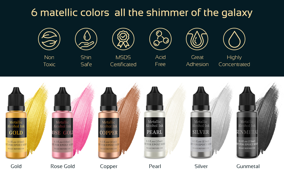 🌟【SHIMMER & VIBRANT METALLIC ALCOHOL INK 】: A wonderful selection of brilliant and Shimmer colors, includes: ROSE GOLD, GOLD, SILVER, COPPER, GUNMETAL, PEARL. It has vibrant and shimmering metal color is perfect for creating incredible sparkling layering, overlap effect & gorgeous backgrounds. You will discover an unlimited world of creative metallic color.