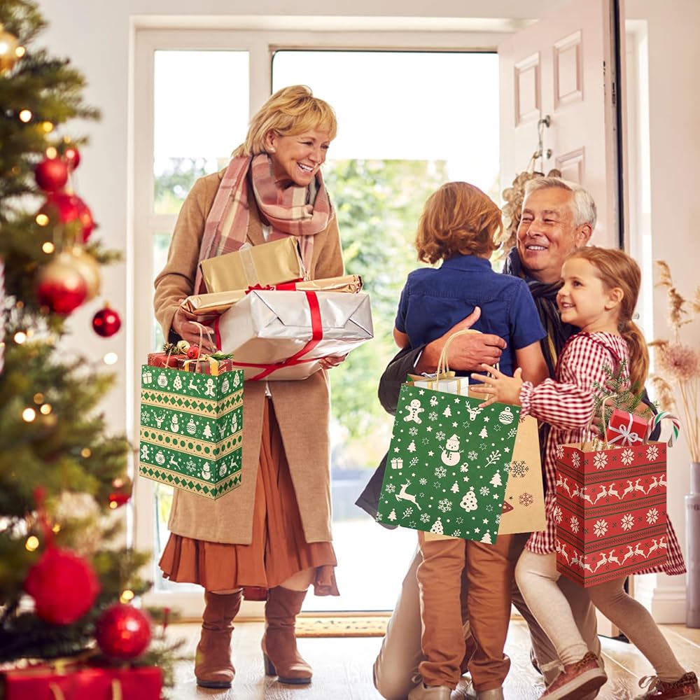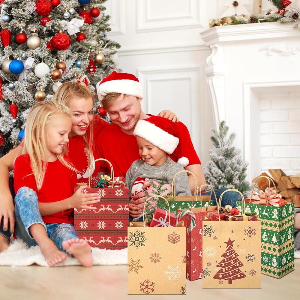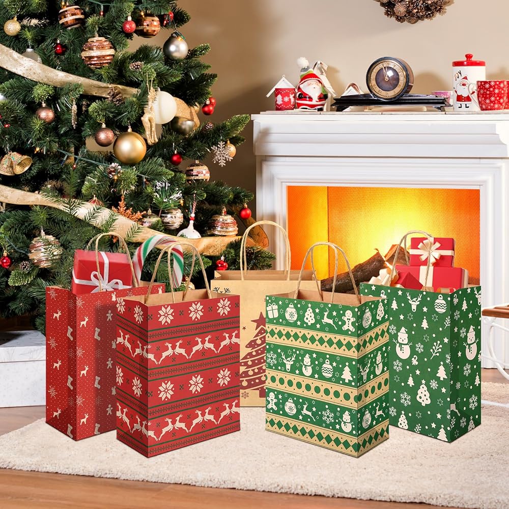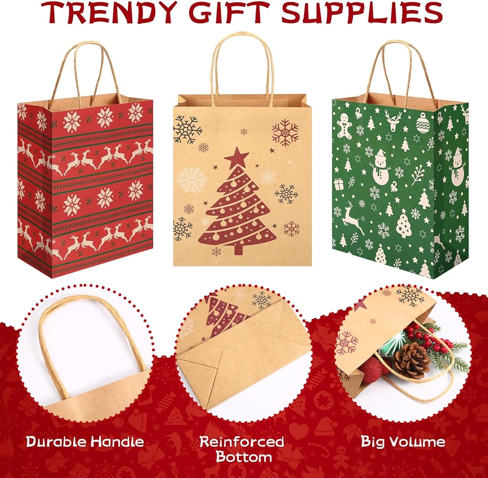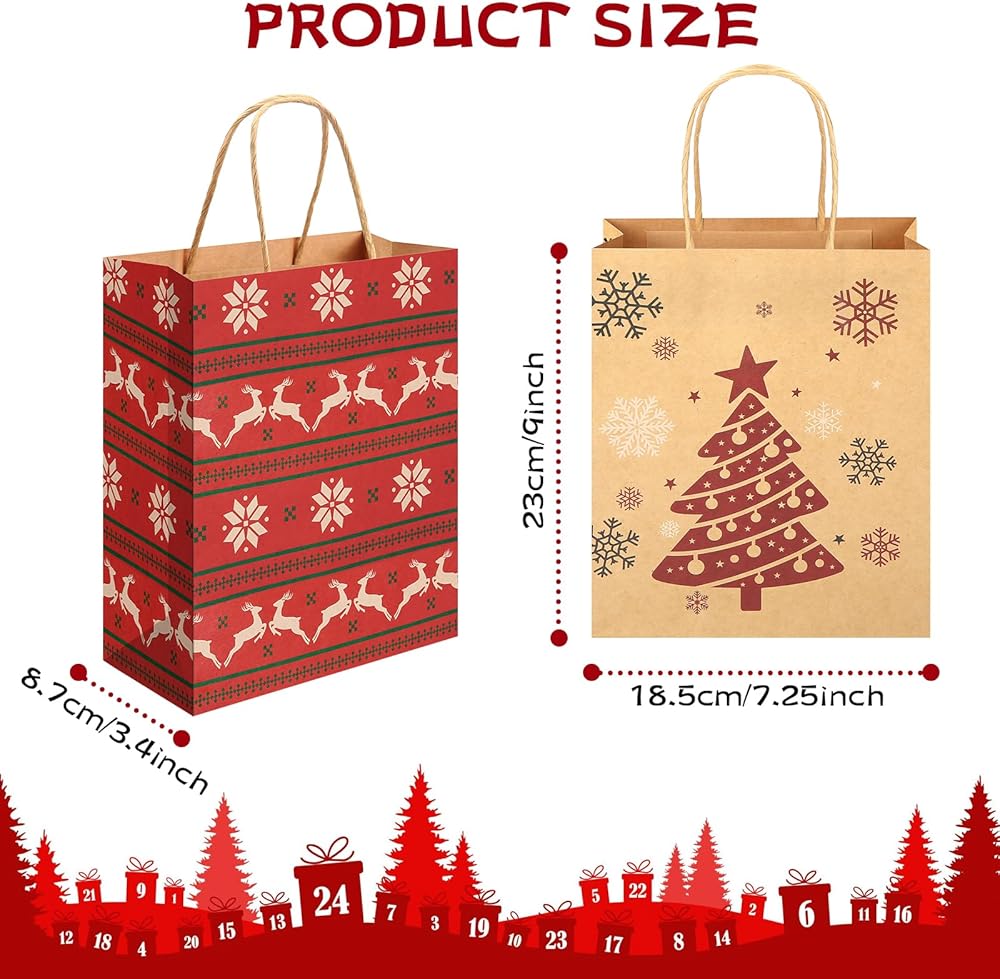 What You Will Get: Christmas kraft bags bulk comes with 24pcs christmas bags with handles and printed in 6 different Christmas designs. 4 pieces of each style.